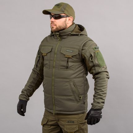 Крій і функціонал: комір‑стійка або низький комір, повна блискавка, утяжки по низу, місткі кишені для документів і дрібного спорядження, іноді світловідбиваючі елементи чи тактичні кольори (олива, койот, чорний, камуфляж).