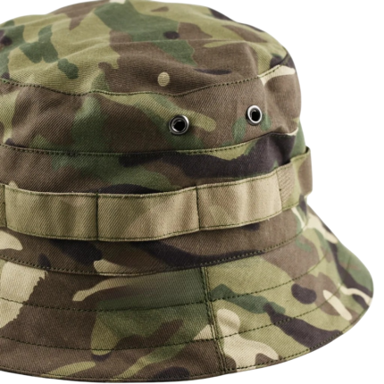 Конструкція: широкі поля для захисту від сонця й дощу, вентиляційні люверси або сітка, ремінець під підборіддя, стрічки/стропи по периметру для кріплення елементів маскування.