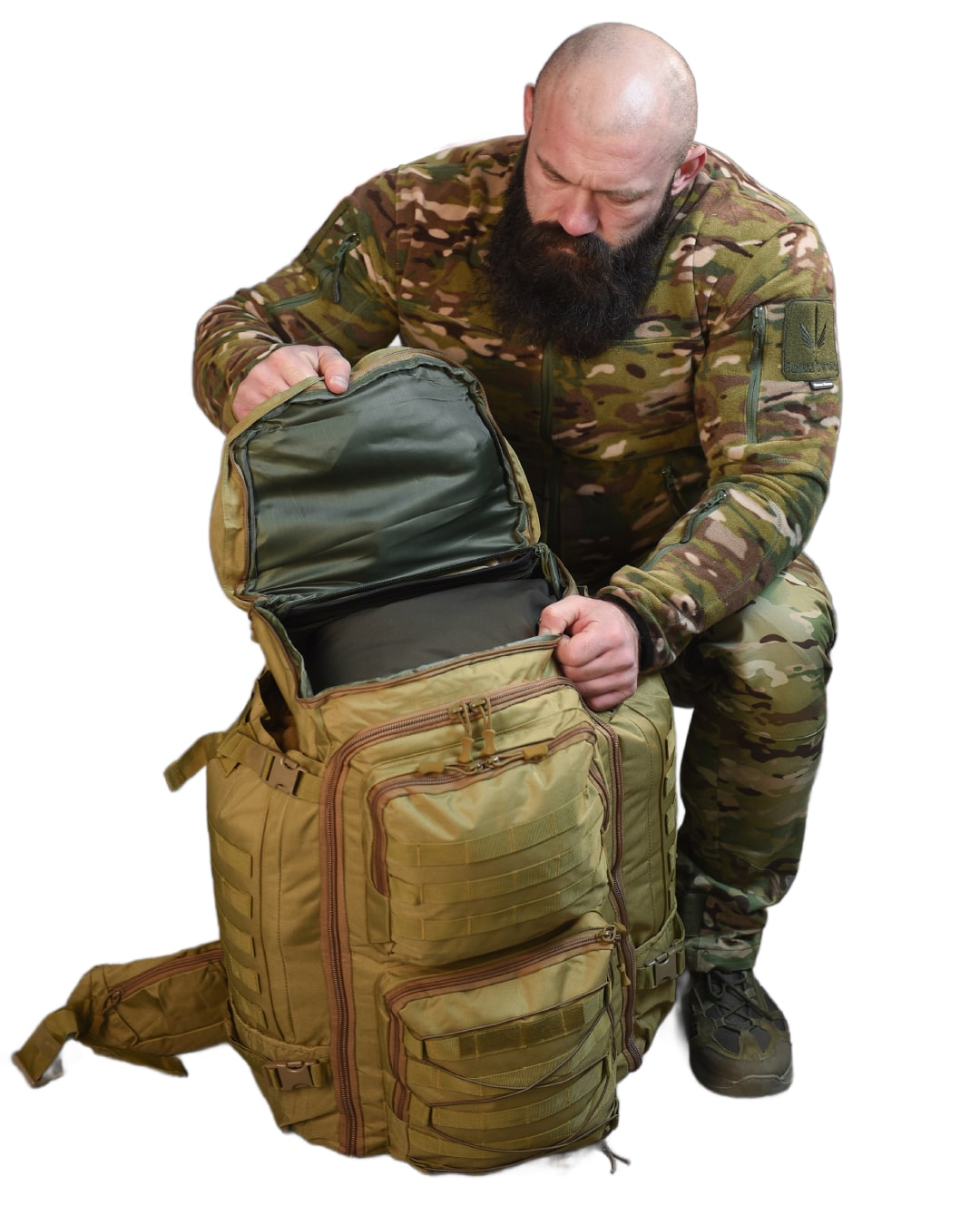 Об’єм у 100 літрів дозволяє розміщувати у рюкзаку великий набір речей залежно від поставленої задачі. Він підходить для коротких і тривалих маршів, польових виїздів, поїздок у гори, експедицій, волонтерських завдань та транспортування спорядження. Цей тактичний рюкзак створений для перенесення: