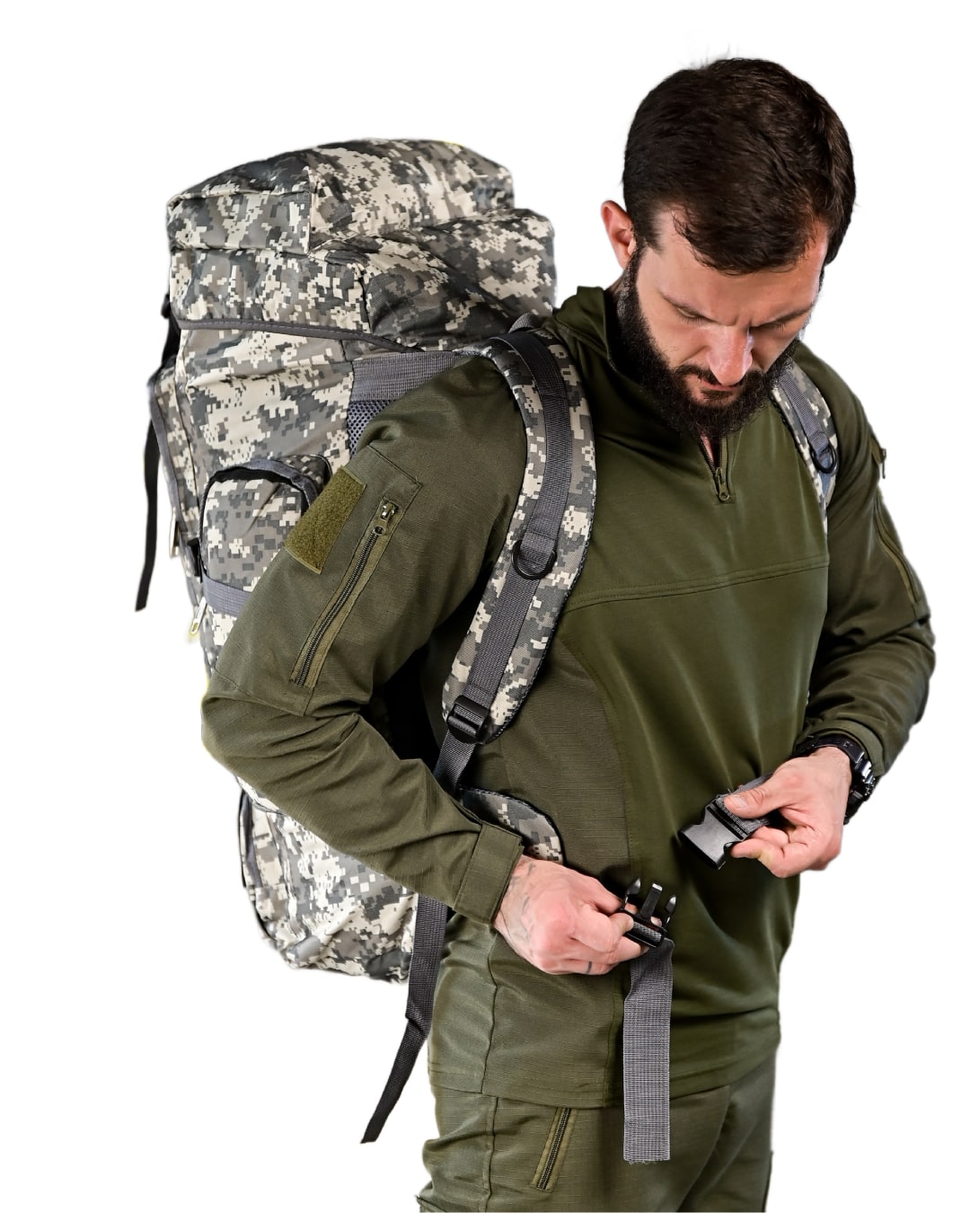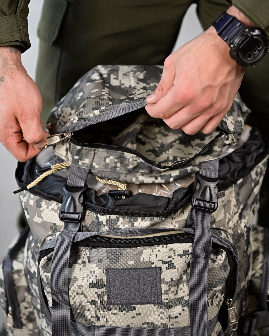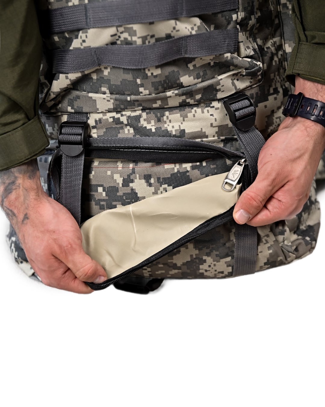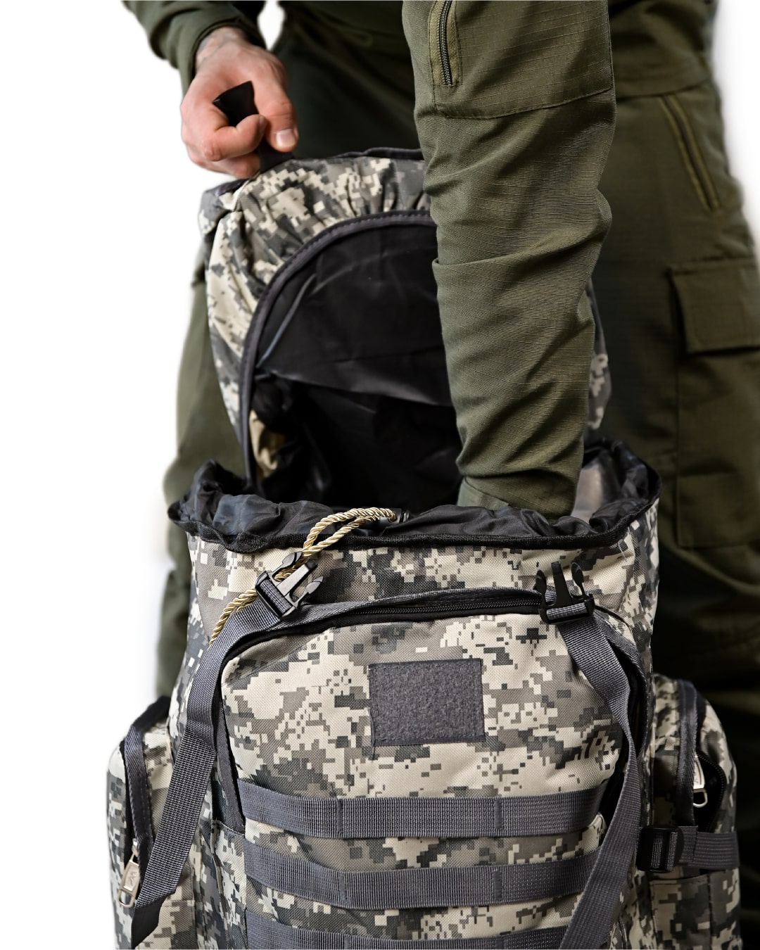 Рюкзак тактичний 50 л у камуфляжі «піксель» — це місткий, практичний, універсальний армійський рюкзак, який підходить для військової служби, туризму та повсякденного використання. Він поєднує продуману систему кишень, комфортну ергономіку та водовідштовхувальний матеріал. Без зайвих деталей, орієнтований на функціональність, цей тактичний рюкзак стане зручним вибором для тих, хто цінує порядок і надійність у спорядженні.