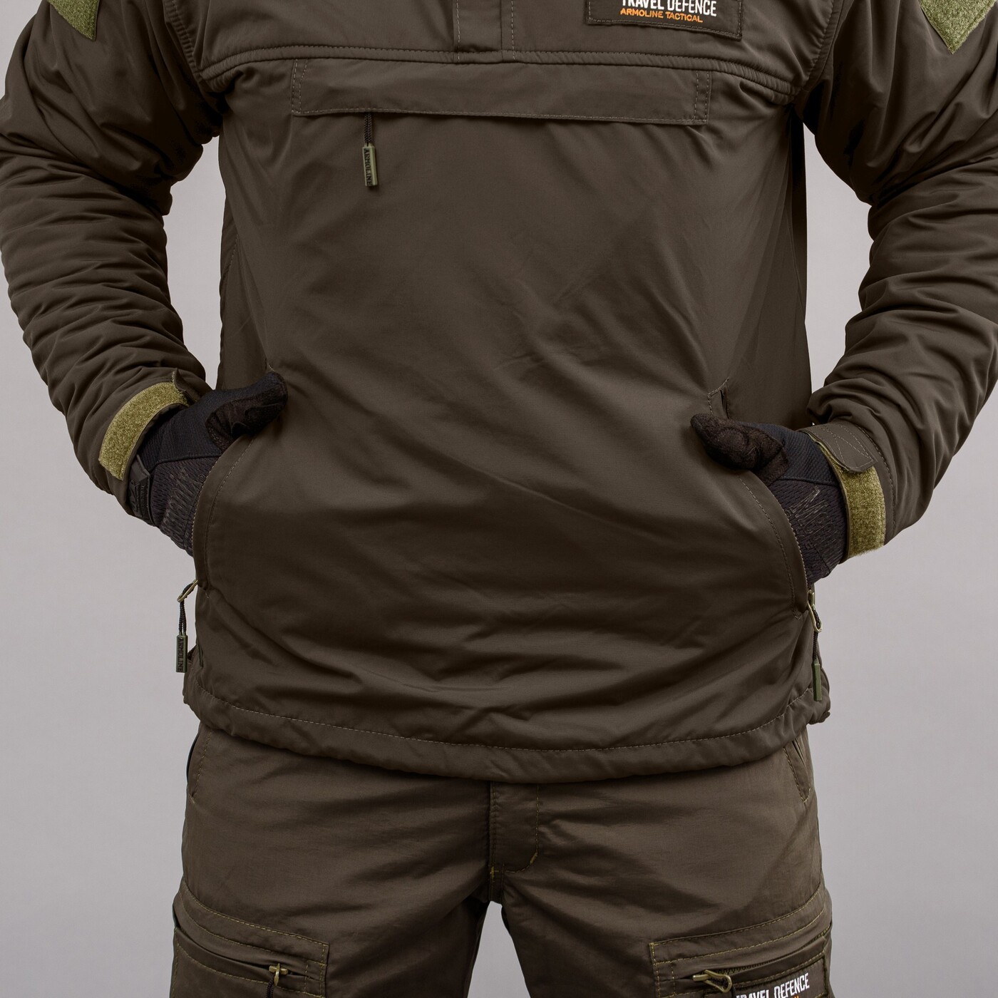 Анорак (одягається через голову) це вид одягу який заслужив повагу у людей багато часу проводять поза домом! Конструкція дозволяє відчути себе захищеним від вологи і вітру, відсутність звичних гудзиків і блискавок дозволяють зберегти максимум тепла без товстого утеплювача. Правильний анорак повинен бути легким, не обмежувати рухів, забезпечувати максимум комфорту – "TRAVEL DEFENCE" якраз такий анорак!