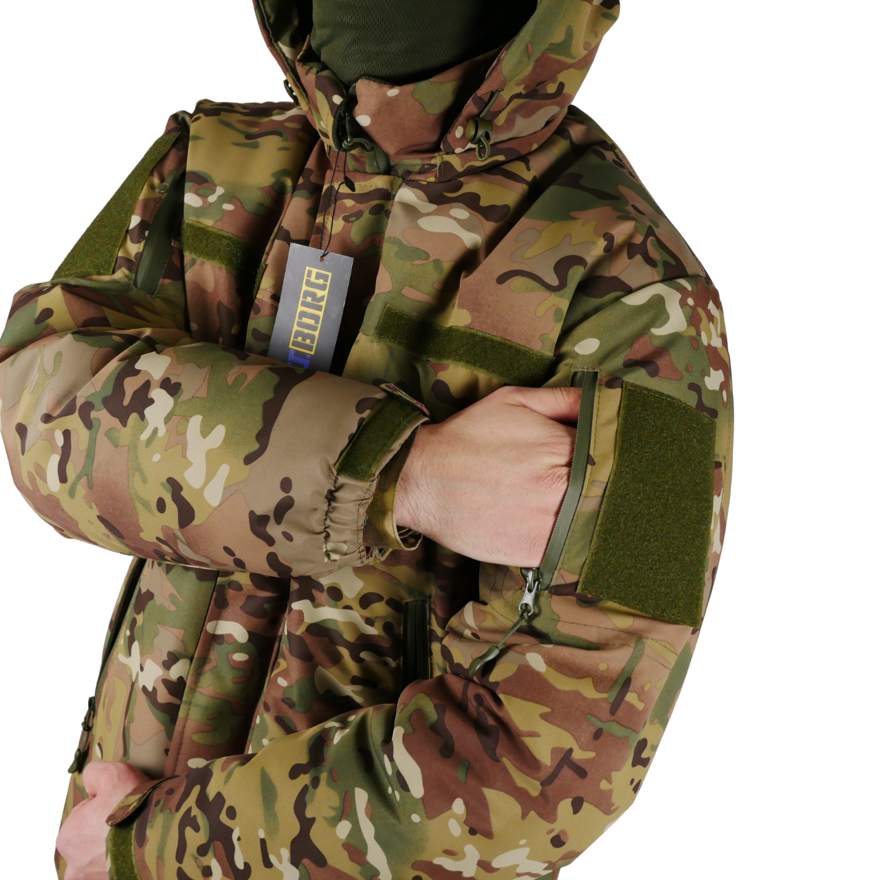 На обох рукавах (по 1 шт.) та спереду (3 шт) на бушлаті є велкро-панелі для шевронів.