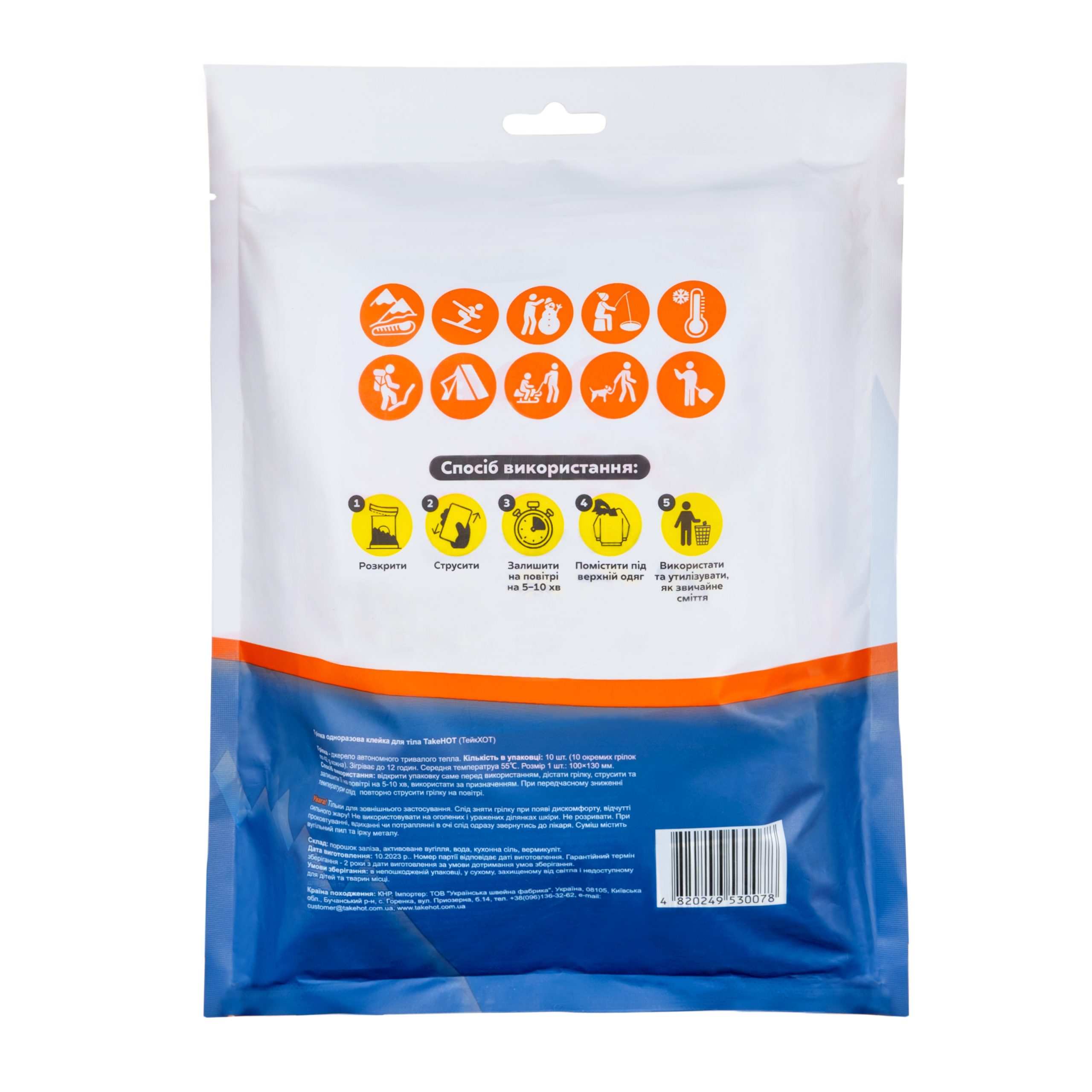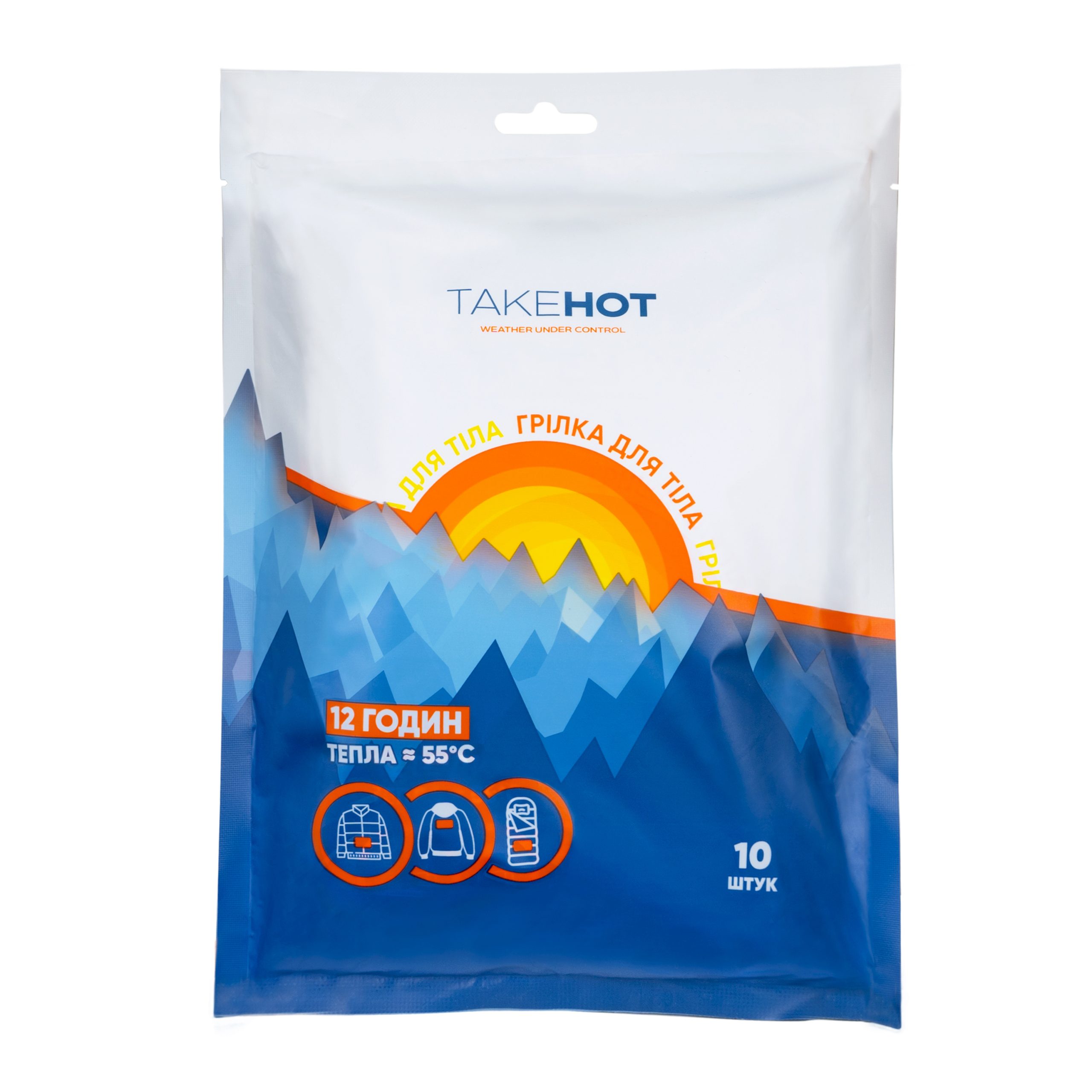 TakeHot — це одноразова грілка для тіла, що активується при контакті з повітрям. Вона безперервно виробляє тепло до 12 годин. Завдяки клейкій основі грілку можна приклеїти на футболку/кофту чи на підштаники.