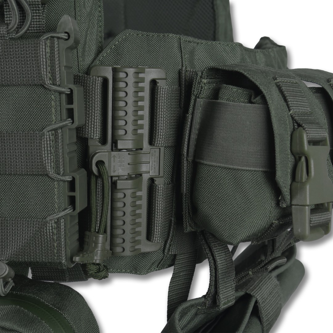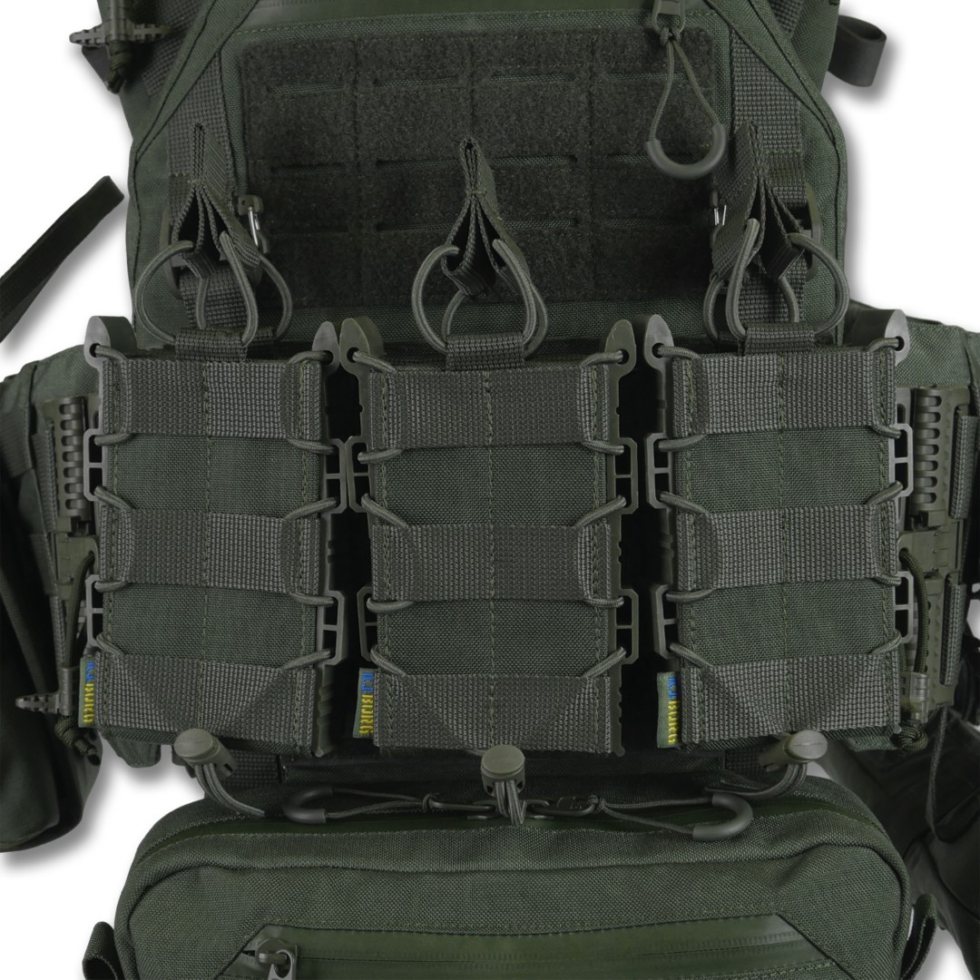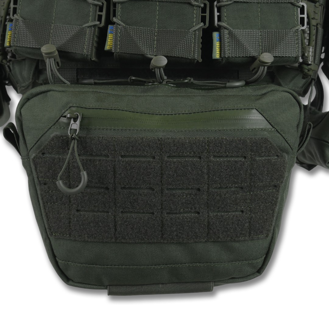 Плітоноска оснащена знімною передньою Molle-панеллю, яка надійно кріпиться до основи за допомогою Velcro і додаткових карабінів Woojin. Це дає змогу зручно розміщувати до трьох підсумків для одного або двох магазинів, а також інше Molle-сумісне спорядження. Панель можна швидко замінити на іншу, заздалегідь підготовлену з необхідними підсумками, що забезпечує гнучкість і зручність під час використання.