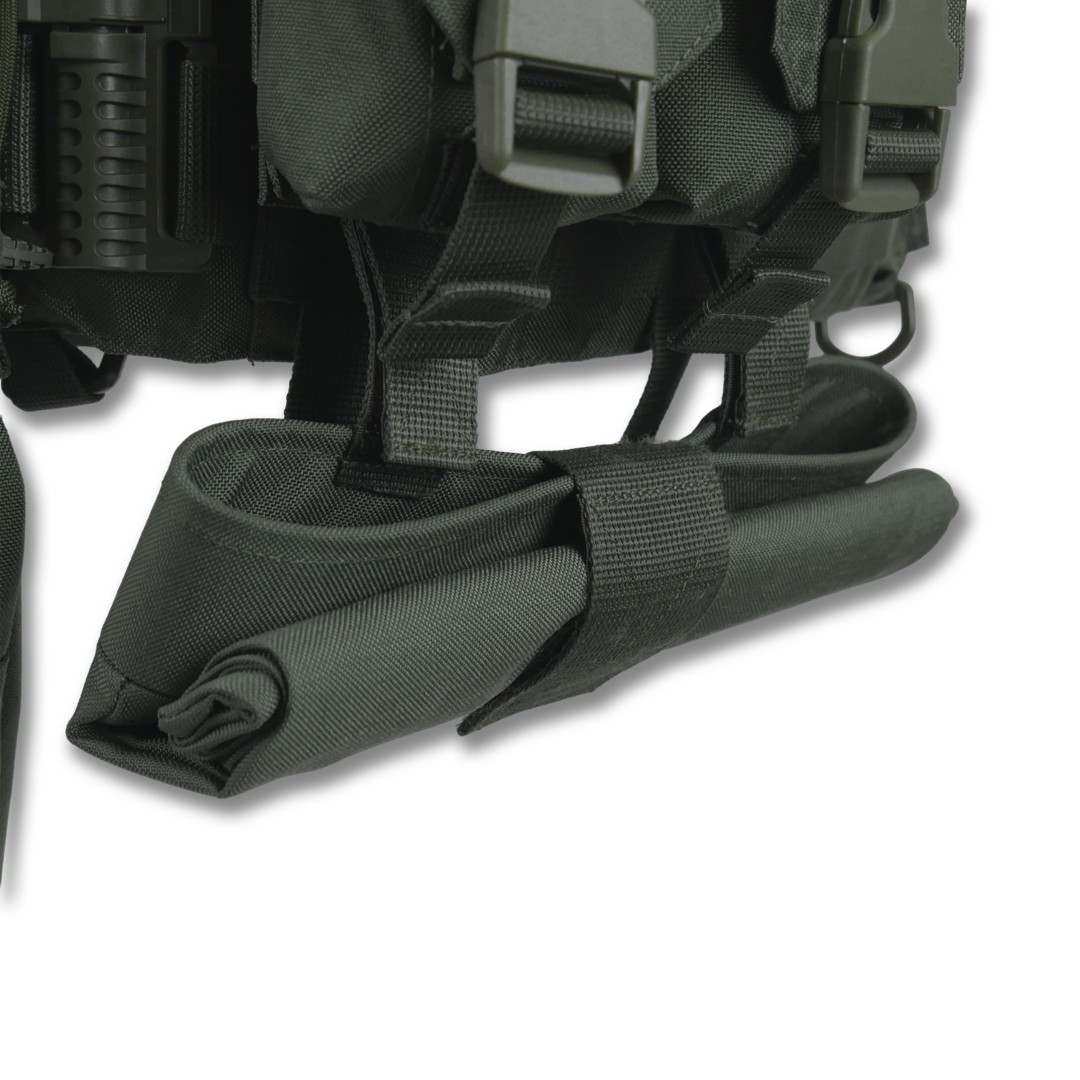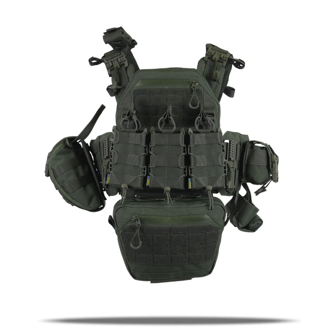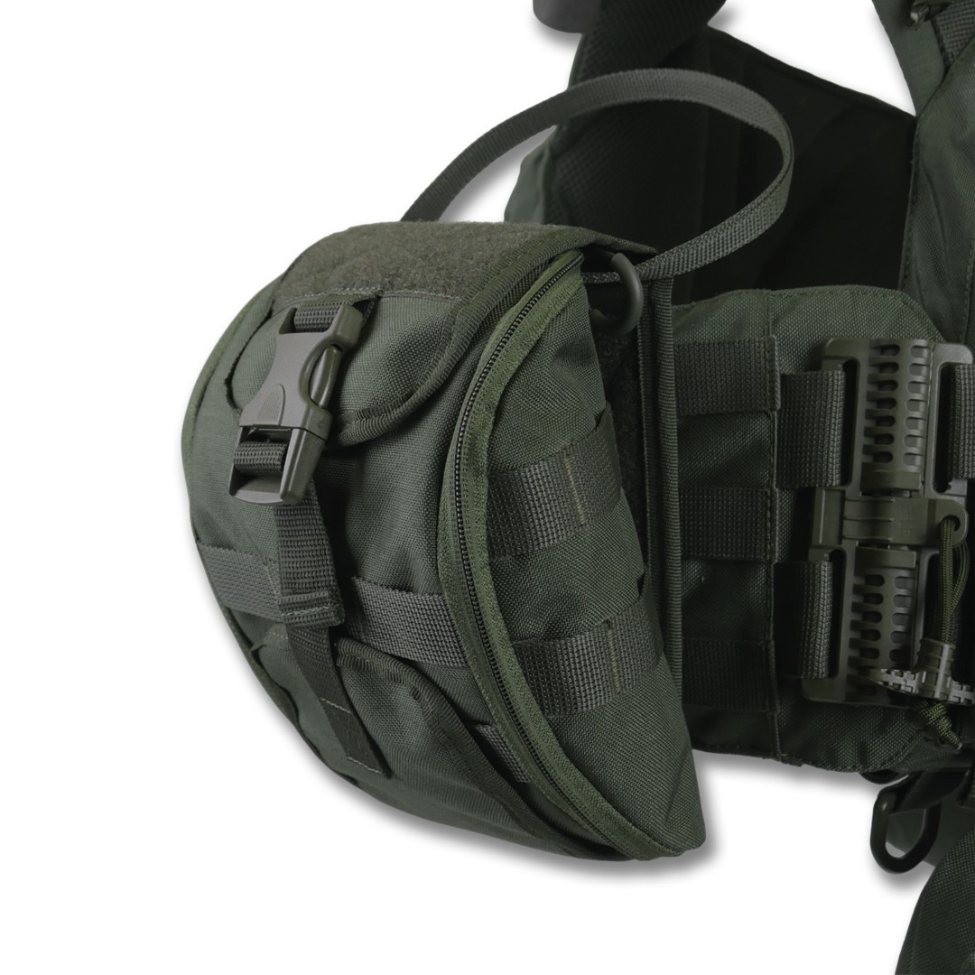 Плітоноска оснащена знімною передньою Molle-панеллю, яка надійно кріпиться до основи за допомогою Velcro і додаткових карабінів Woojin. Це дає змогу зручно розміщувати до трьох підсумків для одного або двох магазинів, а також інше Molle-сумісне спорядження. Панель можна швидко замінити на іншу, заздалегідь підготовлену з необхідними підсумками, що забезпечує гнучкість і зручність під час використання.