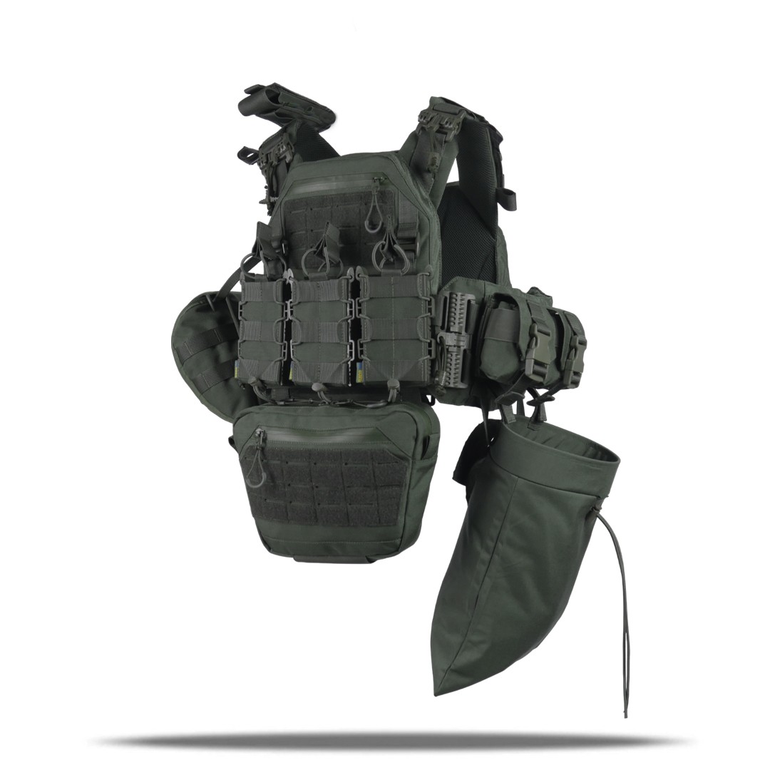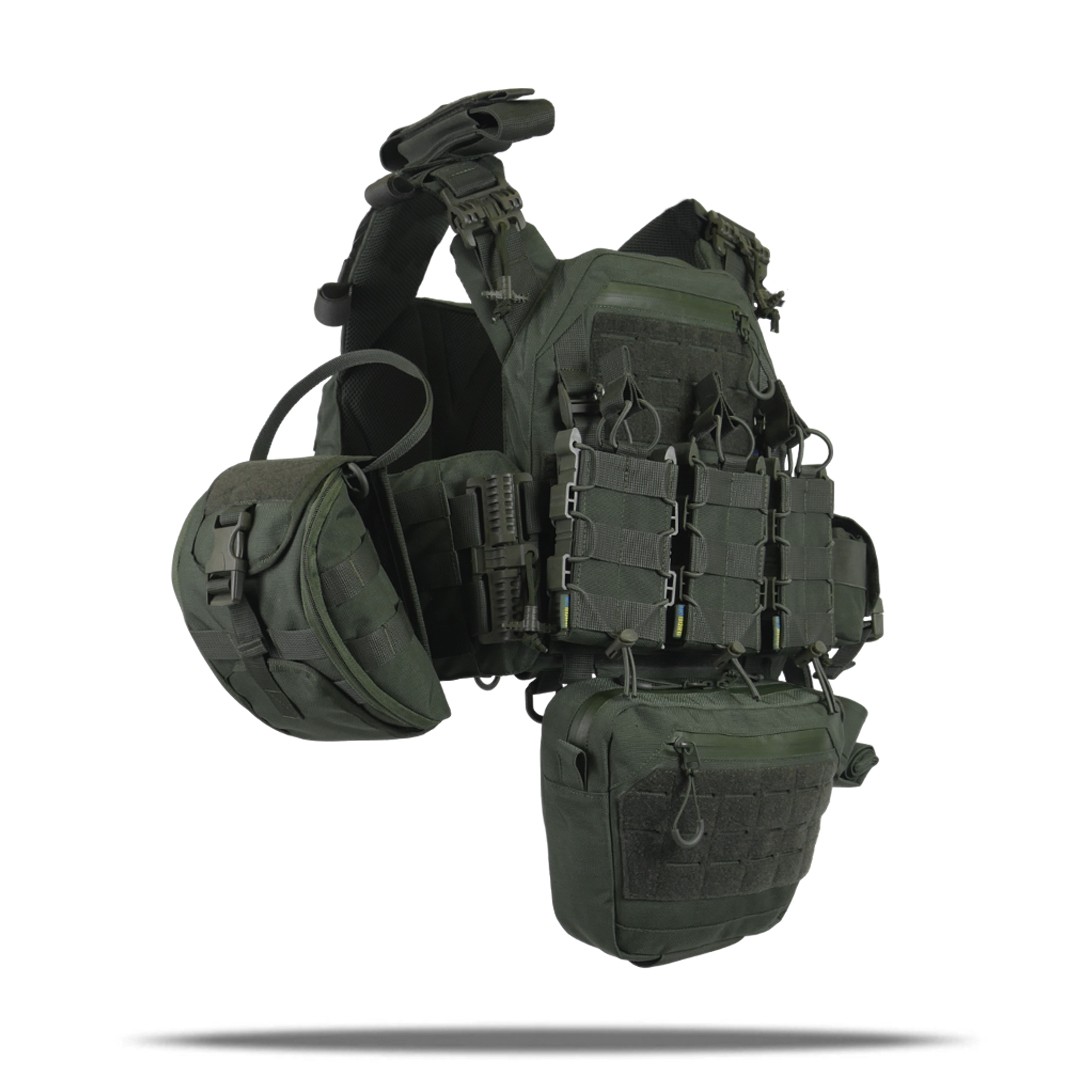 Знімні камербанди з м'якими демпферами, які мають 3 ряди строп Molle для кріплення підсумків і кишені для балістичних пакетів.