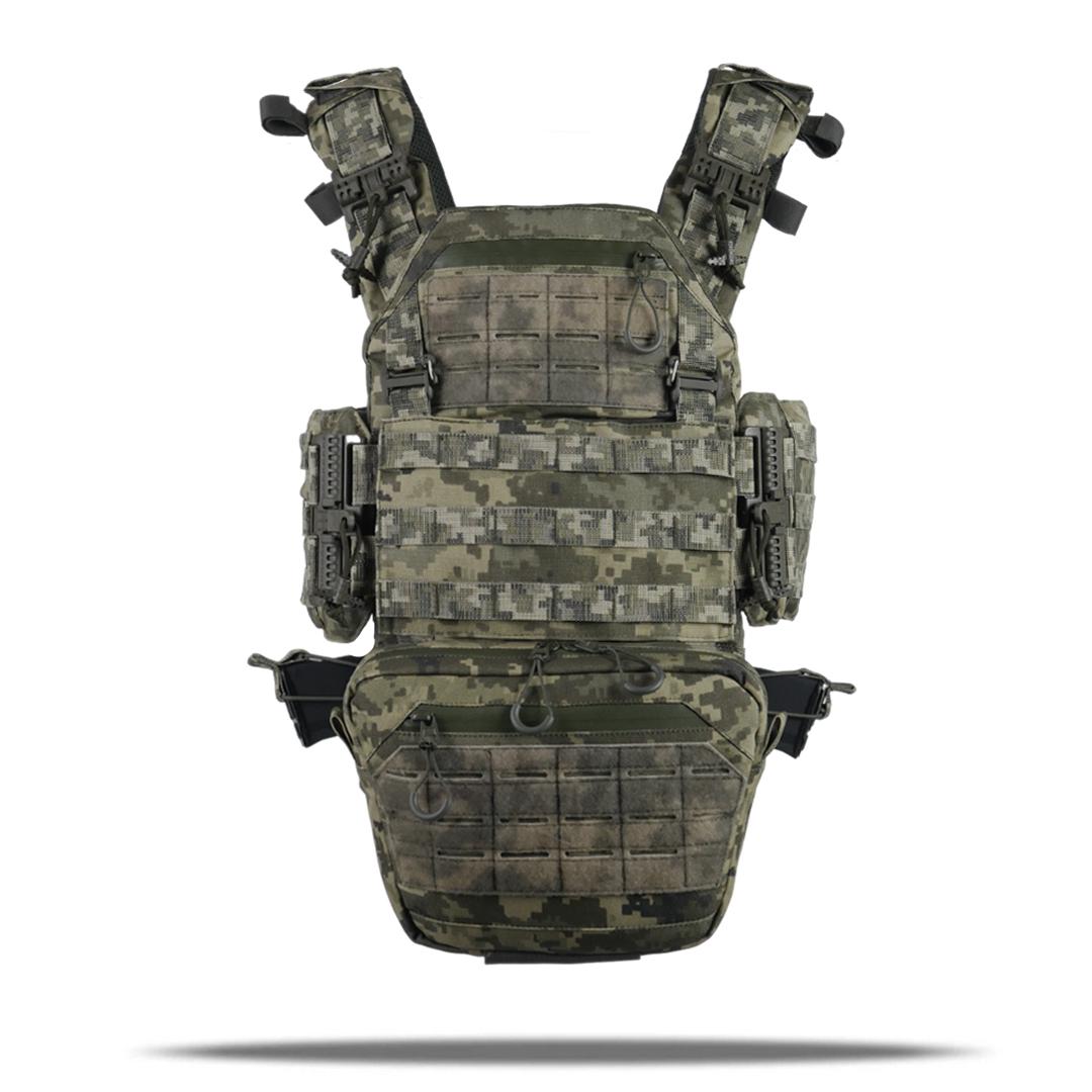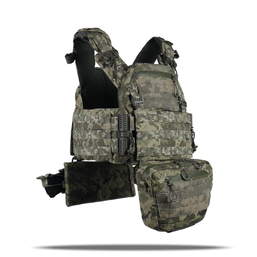Плітоноска виготовлена з матеріалу Cordura Nylon 6.6 1000D з NIR-просоченням, що забезпечує захист від вологи та мастильних матеріалів, а також стійкість до зношування. Її щільність становить 380 г/м², що робить виріб міцним і довговічним. Система Molle використовує технологію Laser Cut з додатковим посиленням для надійного кріплення спорядження. Плитоноска оснащена балістичним захистом 1 класу від компанії Militex, забезпечуючи надійний рівень безпеки. Швидкоскидна система, розташована на плечах і камербандах, дає змогу швидко зняти плитоноску в екстрених ситуаціях. Внутрішні демпферні вставки з 3D-сітки товщиною 3 мм сприяють амортизації та поліпшеній вентиляції під час використання.