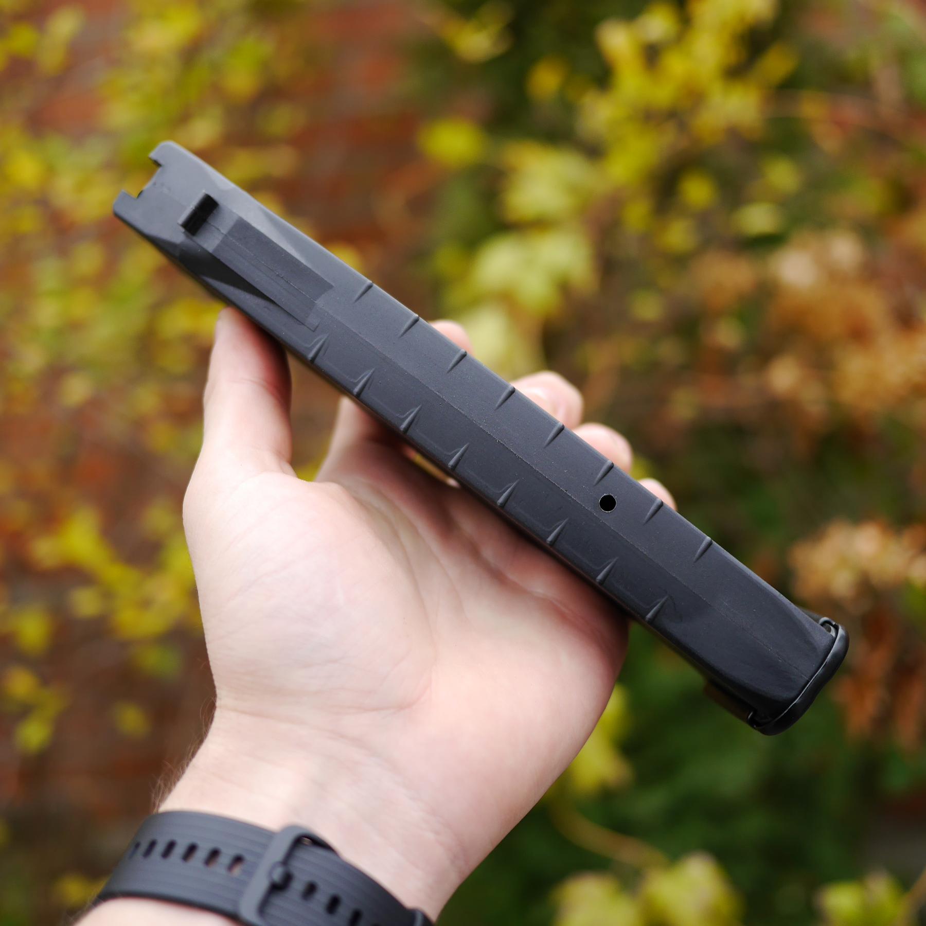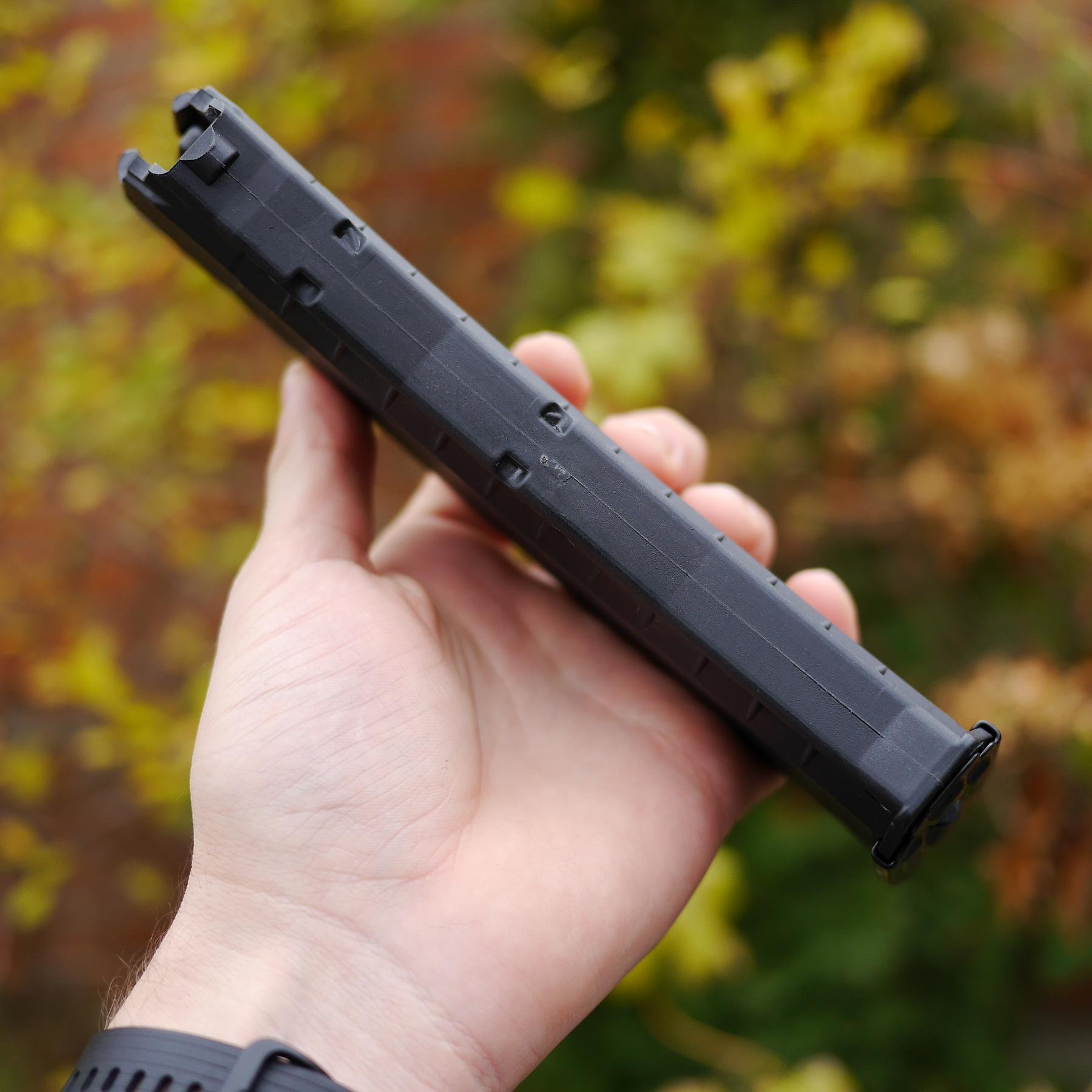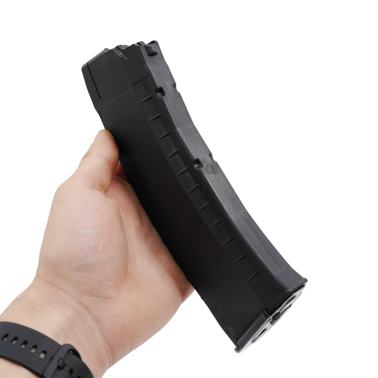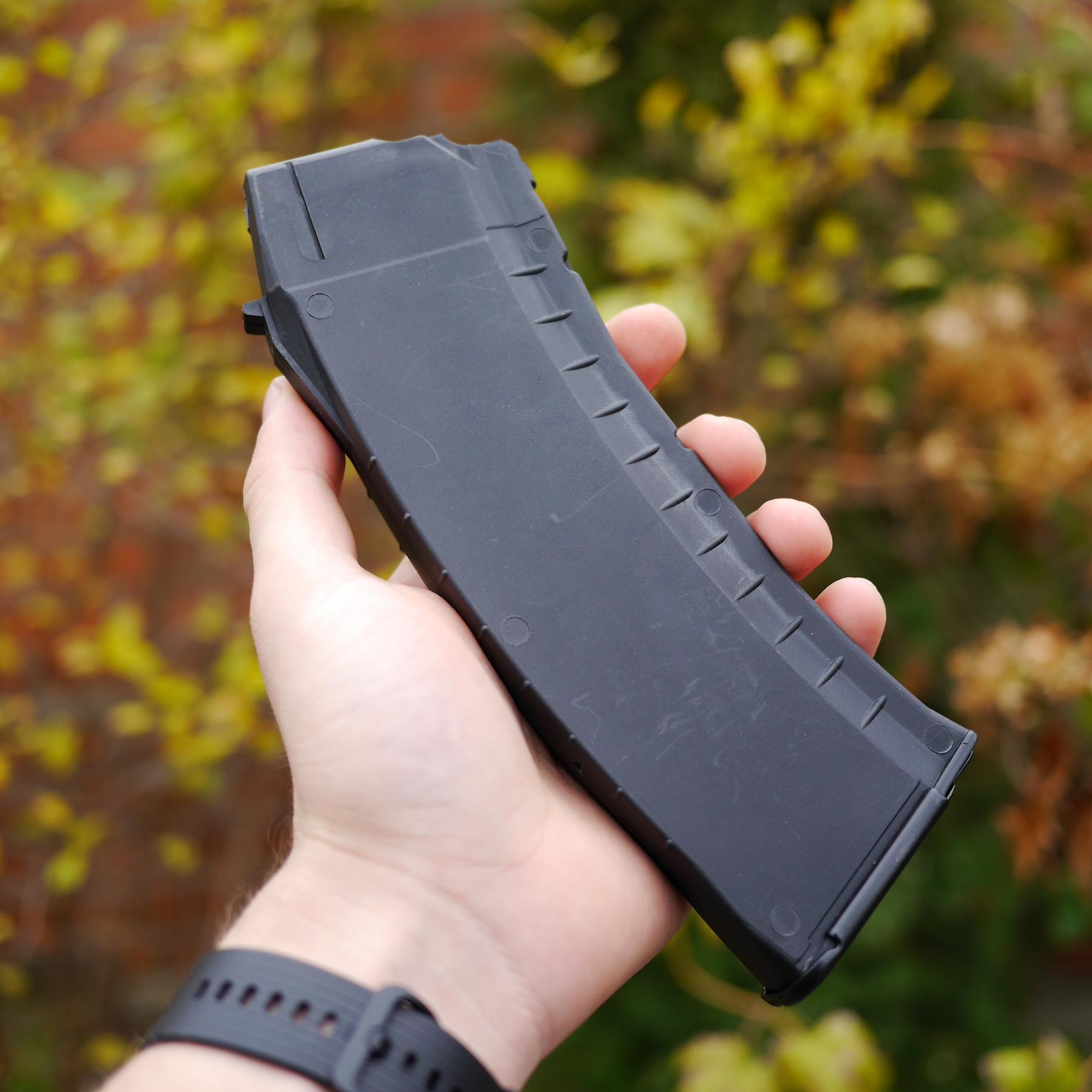 Це міцний пластик на основі нейлону (капролоктану) армованого скловолокном. Пластик з галузі авіакосмічної промисловості, високої в'язкісті, гарною термостійкістю (максимальна температура експлуатації протягом 5 тисяч годин – 95 градусів, мінімальна температура –30 градусів), стійкістю до стирання, високою стійкістю до ударів. Пружина виготовлена із загартованої пружинної сталі та фосфатована для захисту від корозії. Магазин швидко і легко розбирається для обслуговування та чищення. Магазин сумісний з: Рпк 74/74-м, АК 74/74-м, АКС 74-у, АК – 105, Сайга, МК – 5.45, ВП – 148