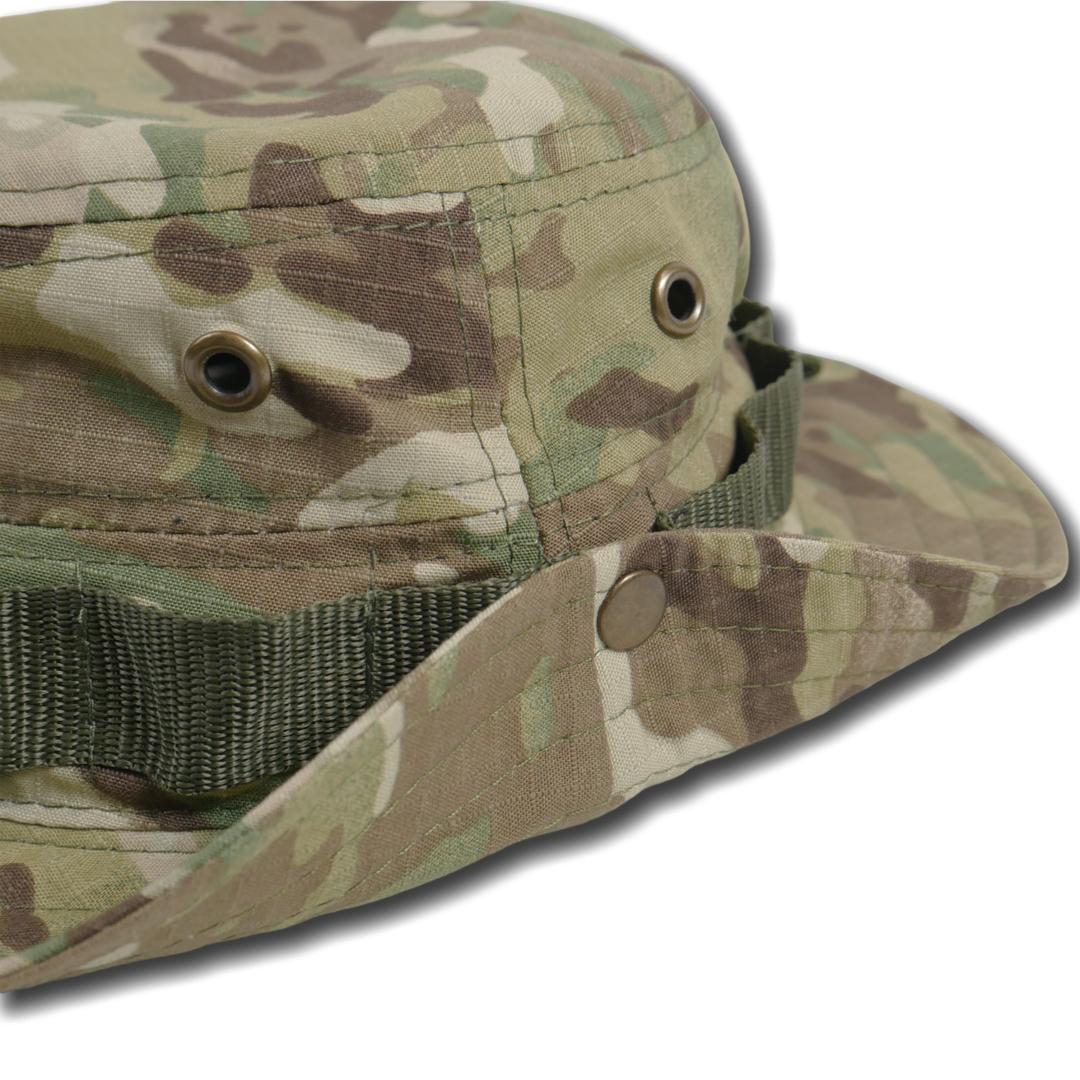 Панама військова тактична камуфльована. Пошита із щільної спеціальної тканини ріп-стоп. Ріп-стоп – тип тканини комбінованого переплетення, в структурі якого використана зміцнена армована нитка. Склад -50% бавовна, 50% поліестр. Тканина з водовідштовхувальним просоченням.