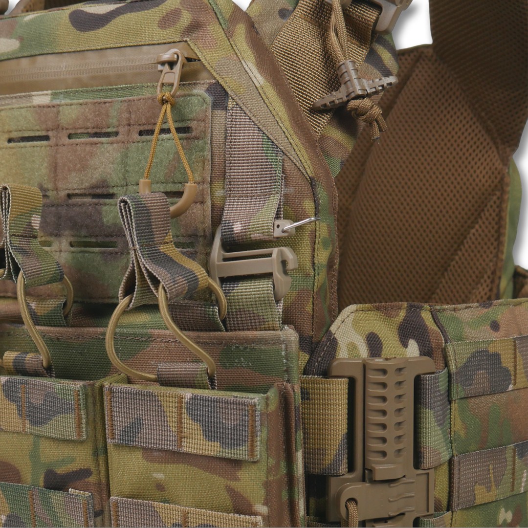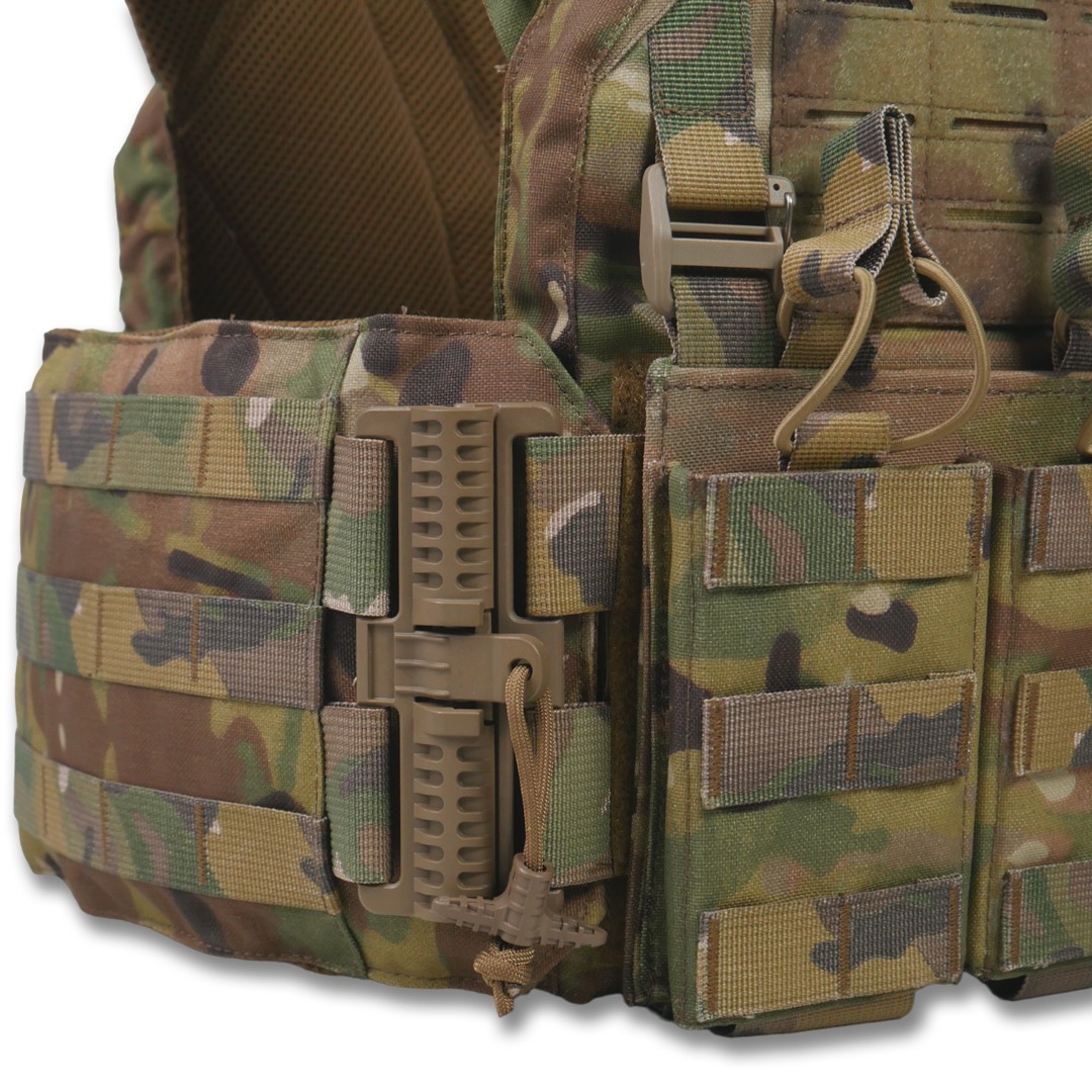 Подвійна система швидкого скидання в зоні плечей і камербандів забезпечує швидке скидання плитоноски за лічені секунди, потягнувши за паракорд.