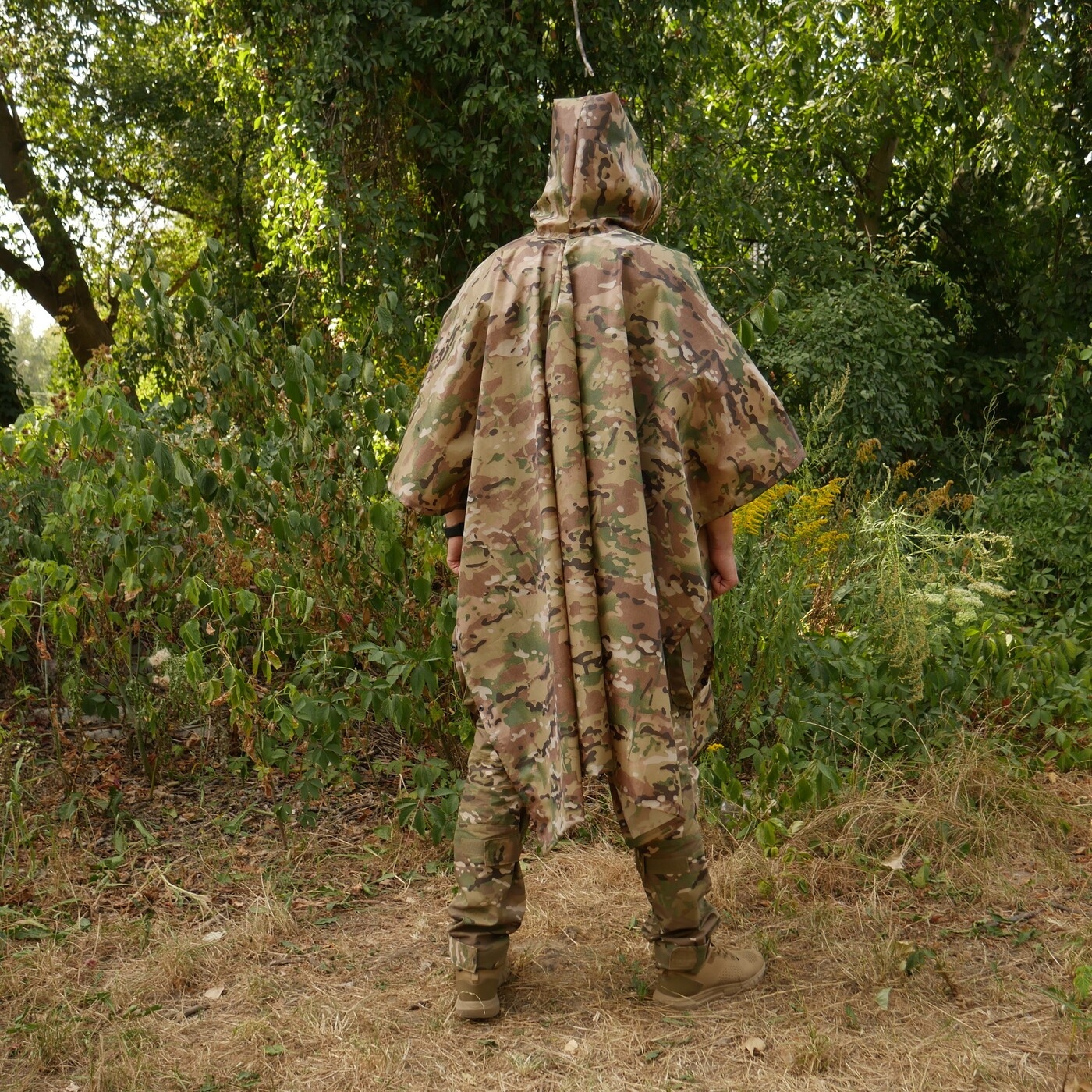 - Захист і покриття: Повністю прикриває руки, тіло та більшу частину ніг, дозволяючи носити поверх одягу або амуніції.