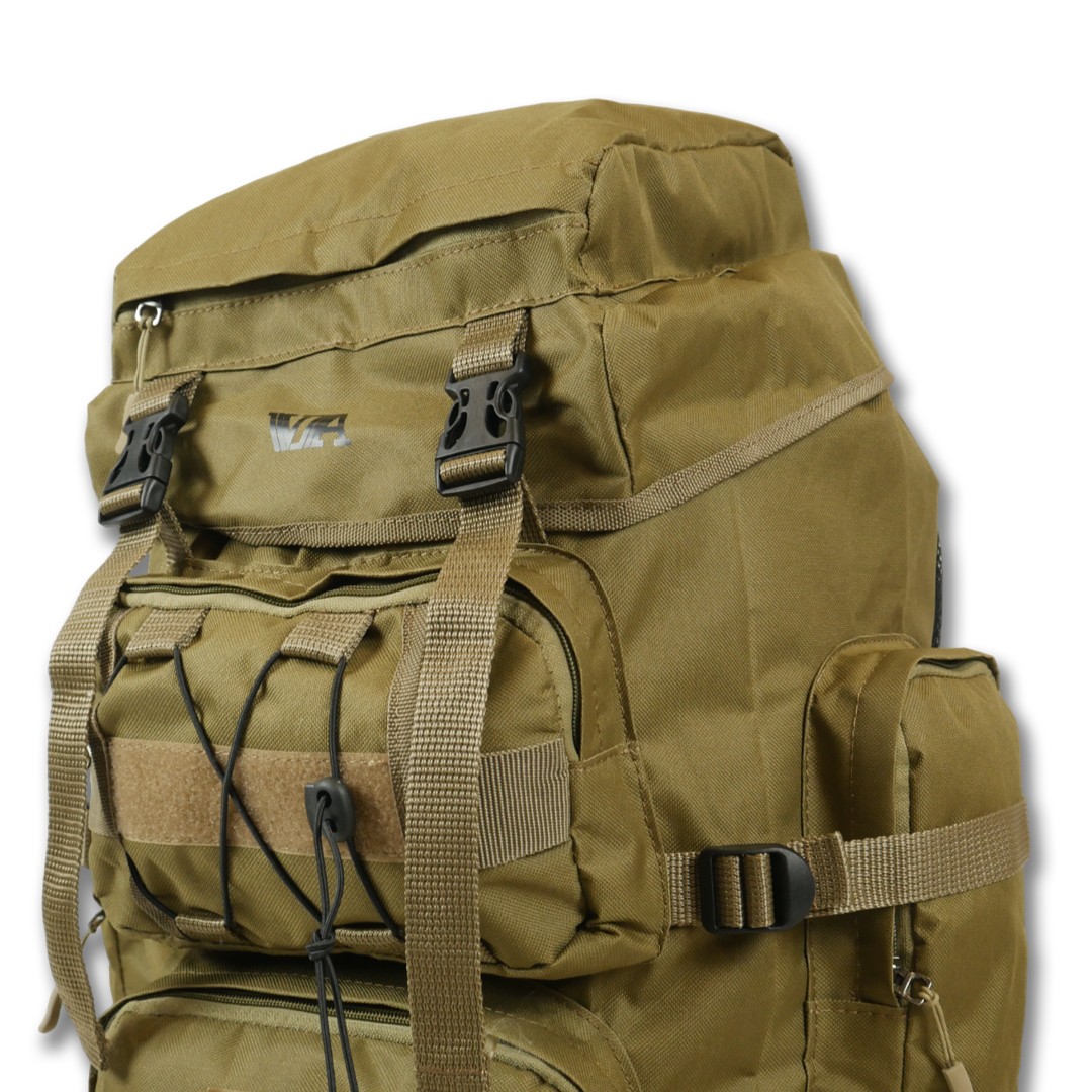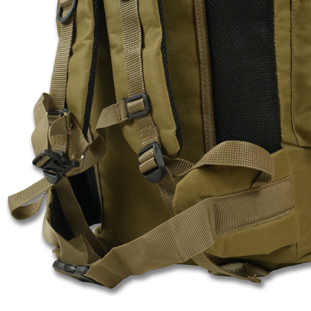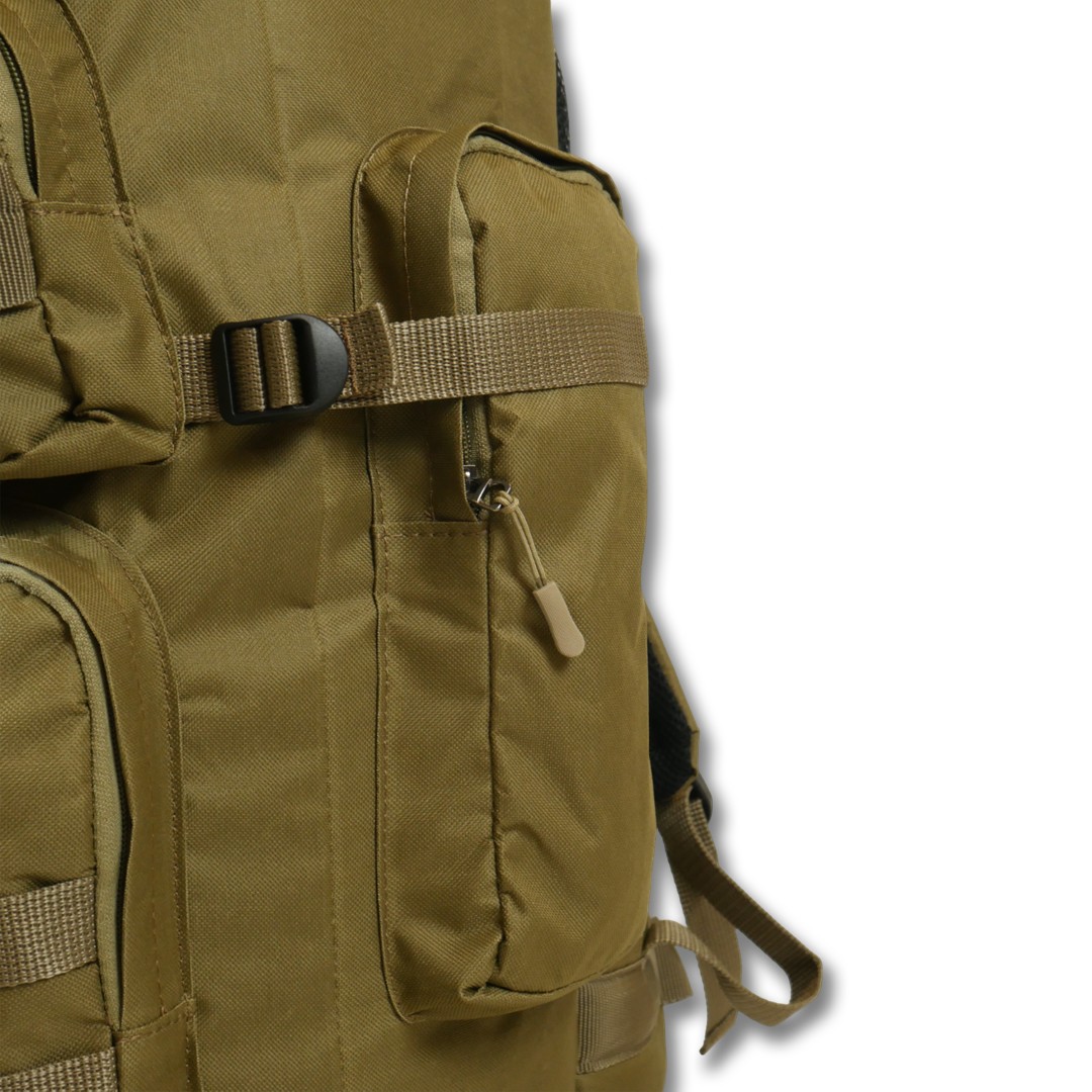 Рюкзак має одне основне відділення, дві передні кишені та дві бокові кишені для зручності організації речей. Додаткова кишеня розташована в клапані, а система MOLLE дозволяє прикріплювати додаткові елементи. Бокові стяжки забезпечують стабільність при транспортуванні, а липучка для шевронів додає можливість персоналізації. Для зручності використання є кріплення для каремату та набедрений пояс, що підвищує комфорт під час носіння.