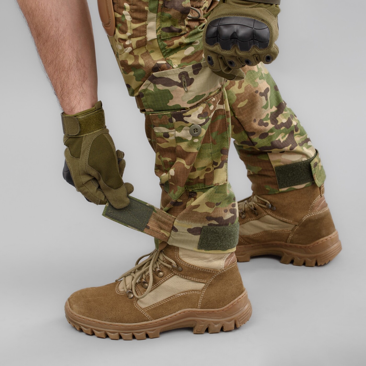 - Нижня частина штанів зі стягуючим манжетом для щільного прилягання до черевика,