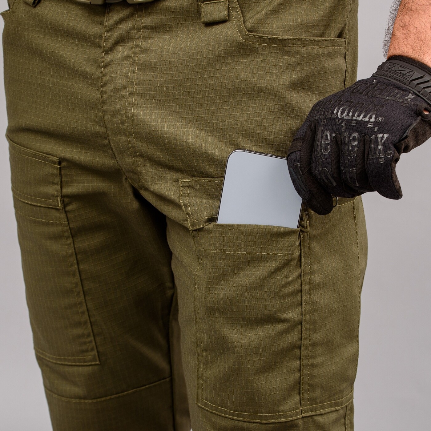 Конструкція штанів досить сучасна, що облягає, трішки завужені до низу, що надає їм охайний бездоганний вигляд. Кишені на стегнах складаються із трьох елементів: зручного зовнішнього відсіку під смартфон, місткої вантажної кишені та маленької кишені всередені великої. Кишеня під смартфон без застібок, але за рахунок розташування клапанів "внахлест" смартфон надійно фіксується, це дозволяє мати швидкий і безшумний доступ до гаджету.