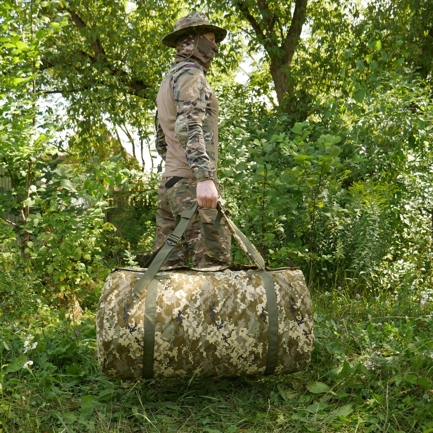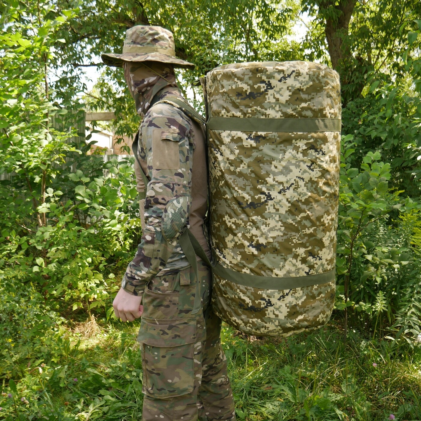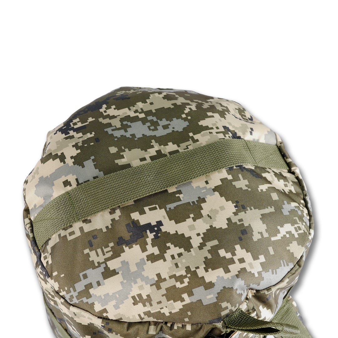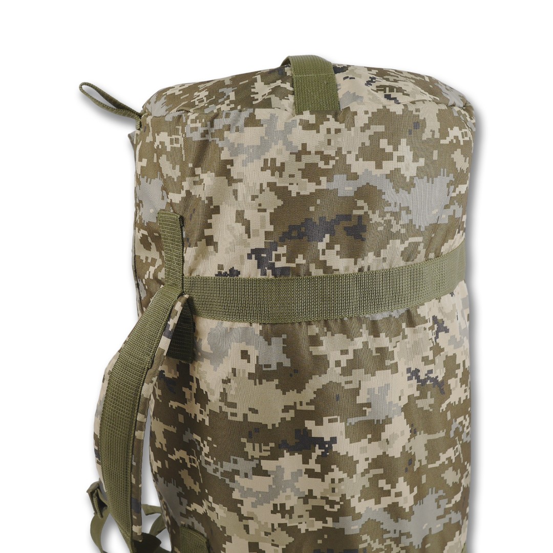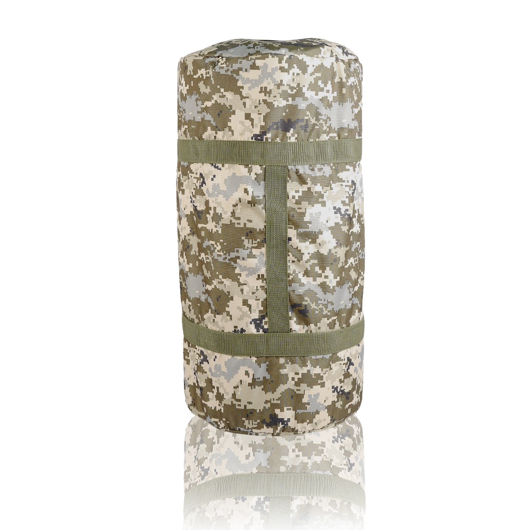 Баул Kiborg 120 виконаний з посиленої тканини Oxford 600D, з водонепроникним просоченням. Конструкція баула передбачає його перенесення двома способами: – на плечах (як рюкзак) – в руці. Для цього баул обладнаний двома м’якими лямками з міцної стропи шириною 5 см. Лямки дають можливість носити баул на спині як рюкзак, і в руках як звичайну сумку. Усі стропи прошиті посиленими швами високоякісною ниткою. Зсередини по периметру шви оброблені та зміцнені окантувальною стрічкою.
