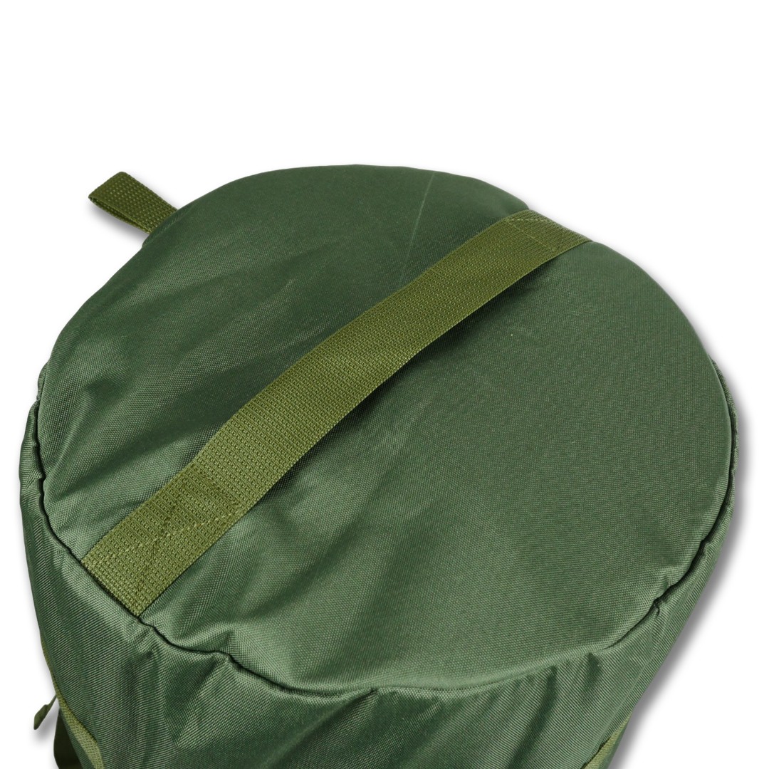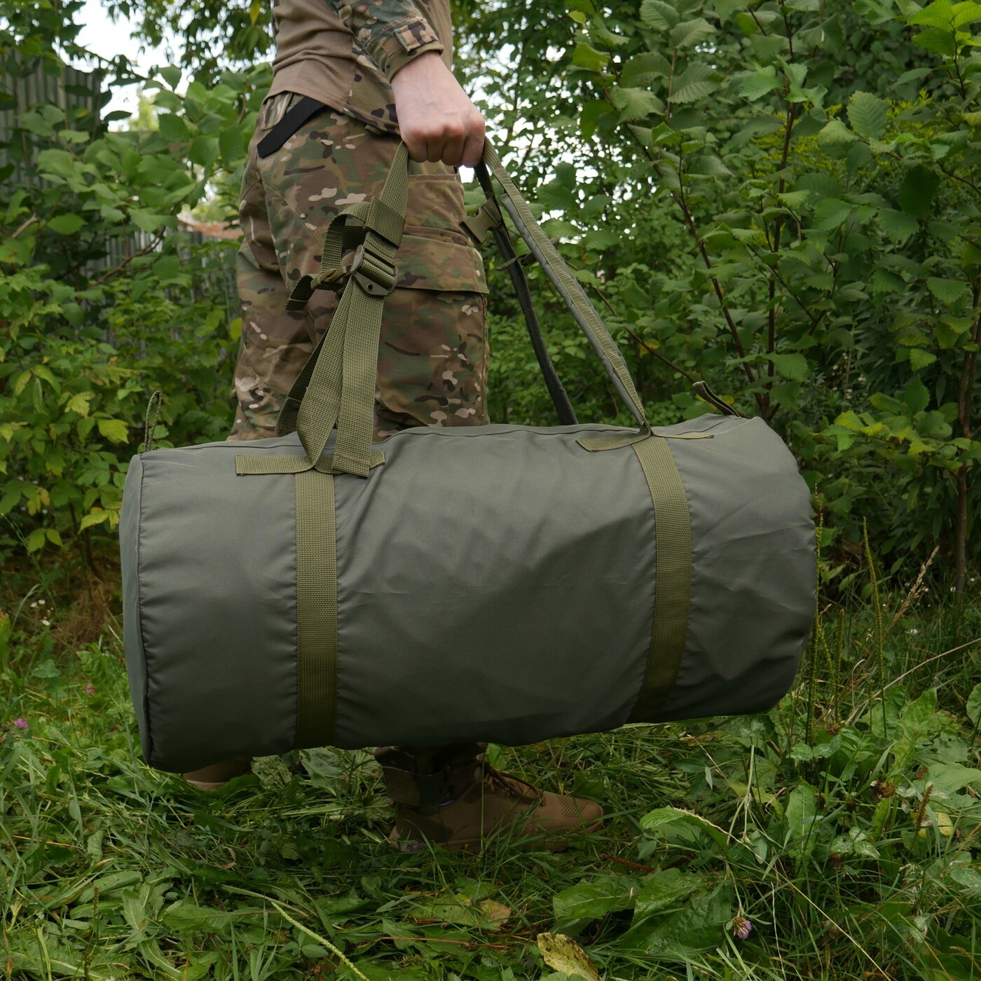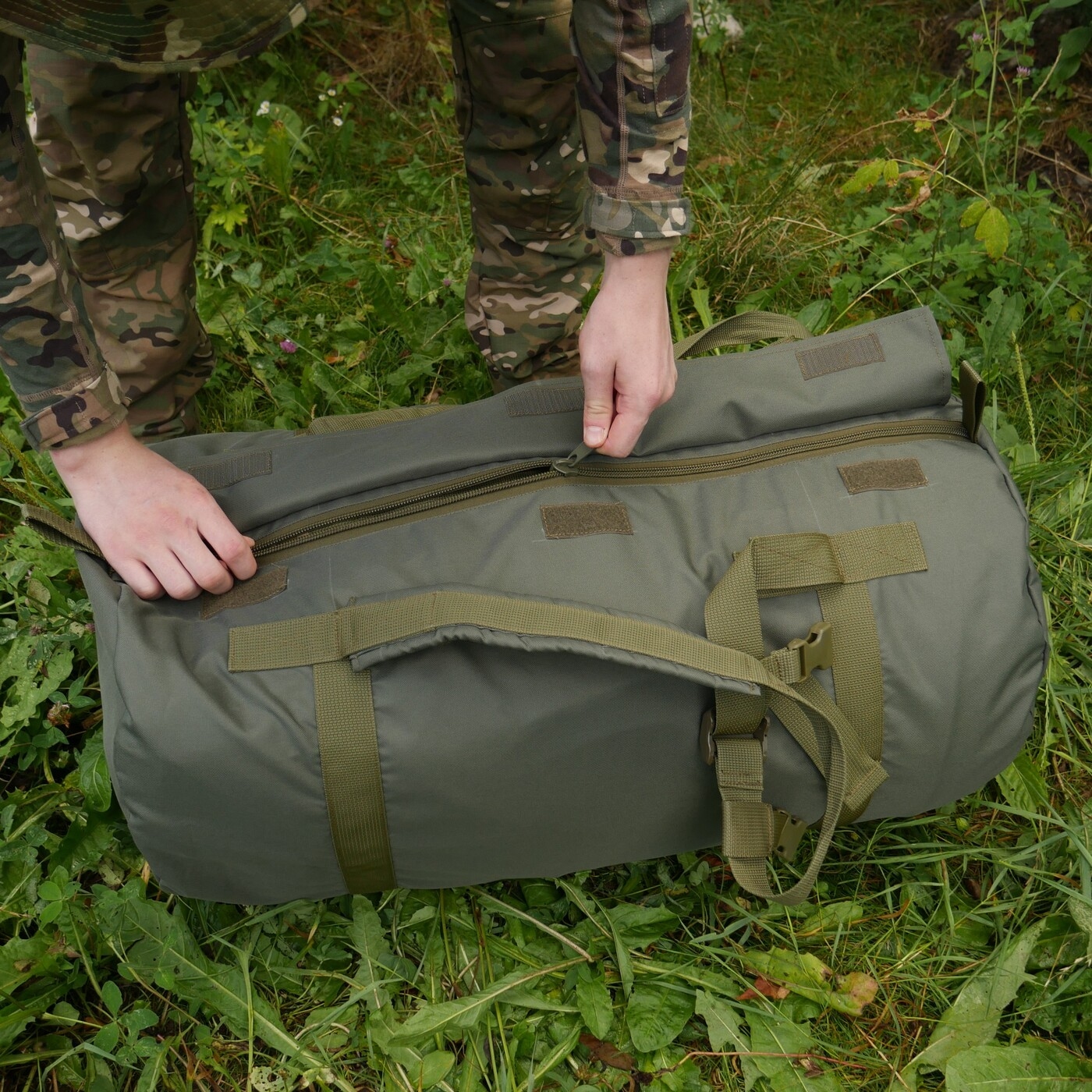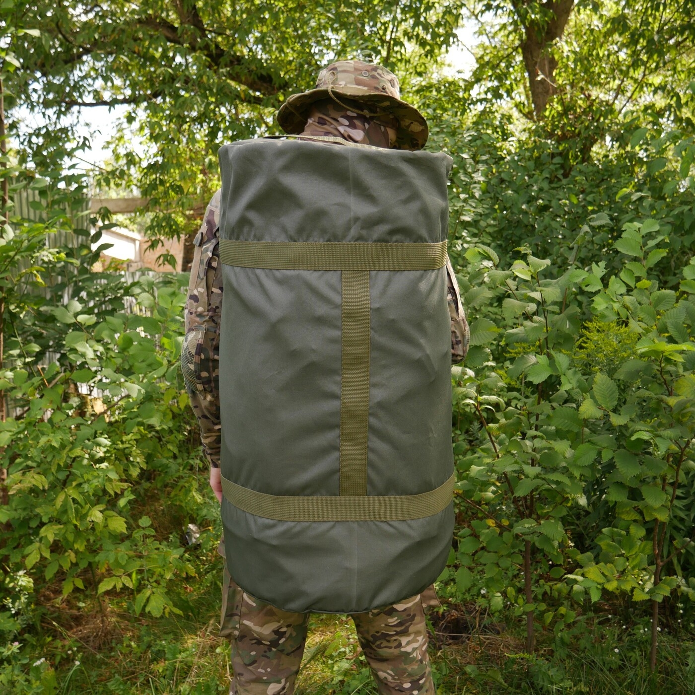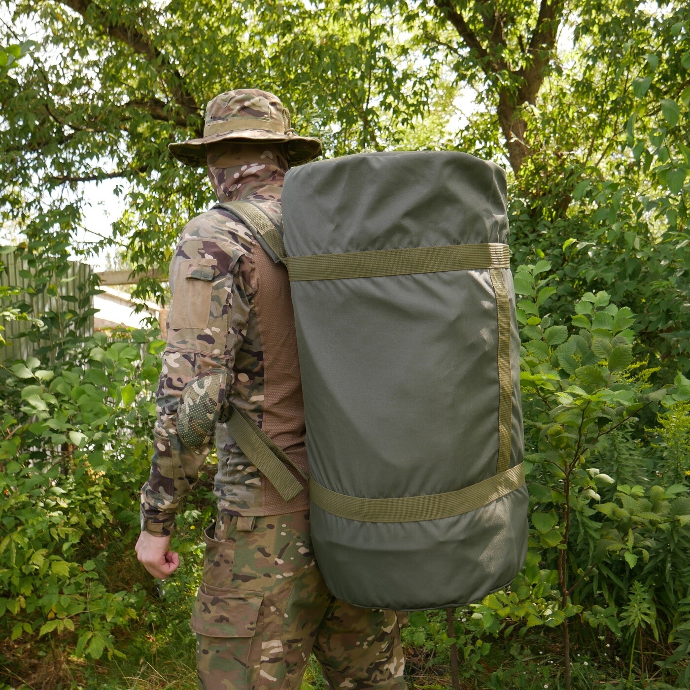 Баул Kiborg 80 виконаний з посиленої тканини Oxford 600D, з водонепроникним просоченням. Конструкція баула передбачає його перенесення двома способами: – на плечах (як рюкзак) – в руці. Для цього баул обладнаний двома м’якими лямками з міцної стропи шириною 5 см. Лямки дають можливість носити баул на спині як рюкзак, і в руках як звичайну сумку. Усі стропи прошиті посиленими швами високоякісною ниткою. Зсередини по периметру шви оброблені та зміцнені окантувальною стрічкою.