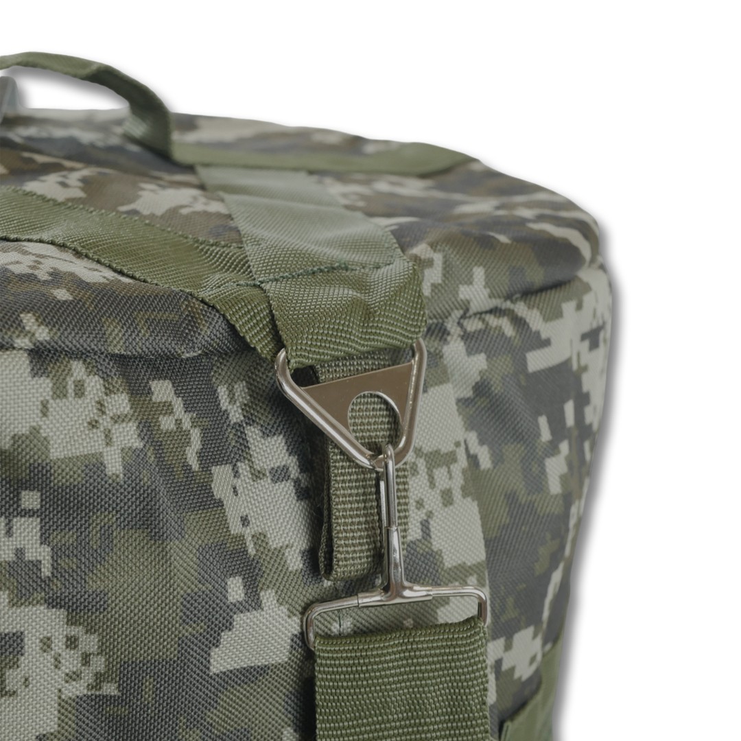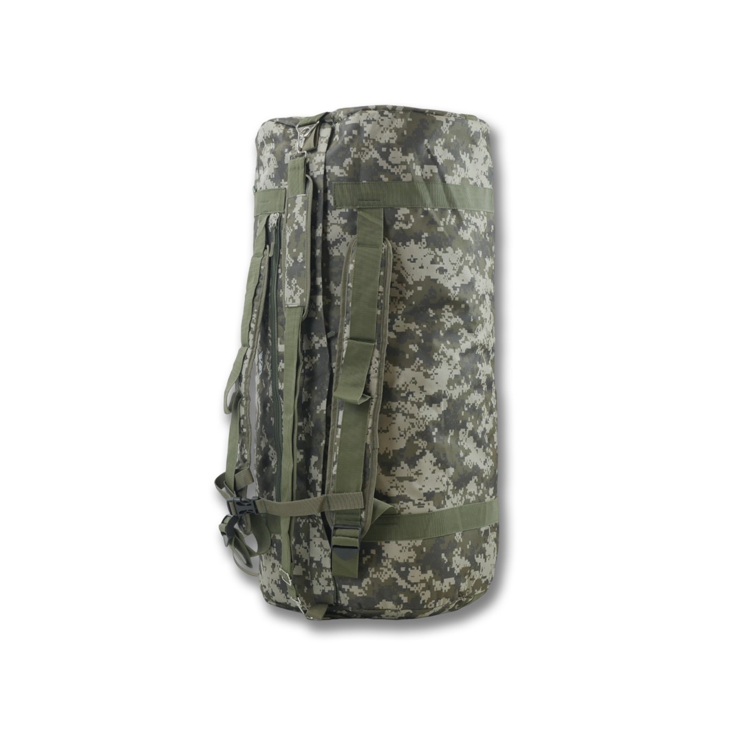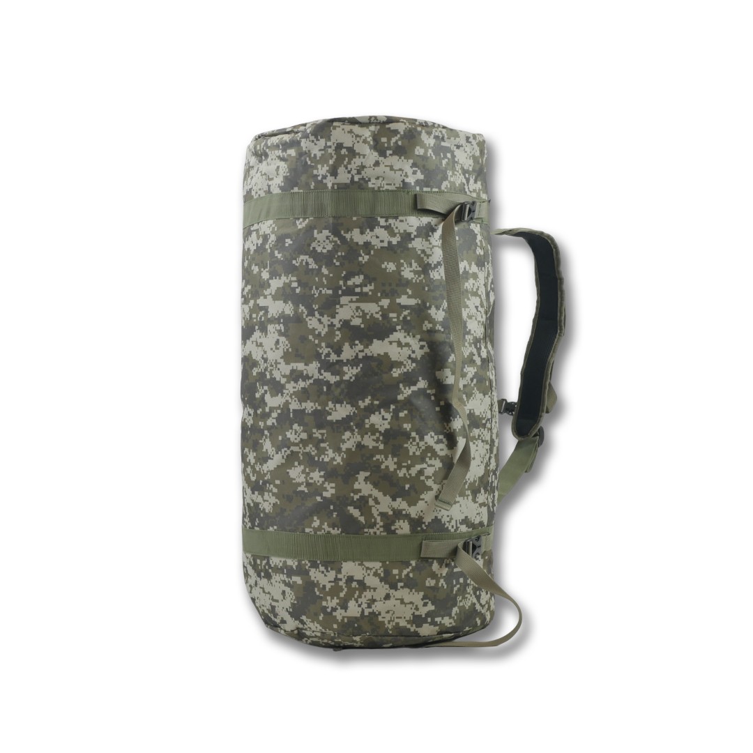 Сумка-баул призначена для перенесення особистих речей, військових, спортивних, туристичних або мисливських приладдя. Особливістю цієї моделі є можливість носіння як сумки, так і рюкзака. Вона виконана з міцної водовідштовхувальної тканини піксельного забарвлення, що забезпечує надійний захист вмісту.