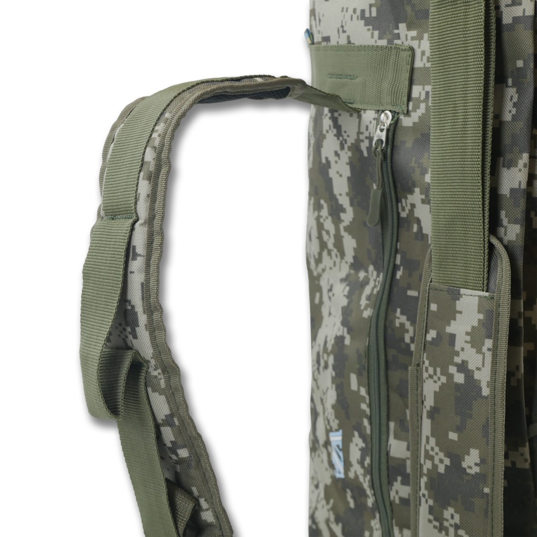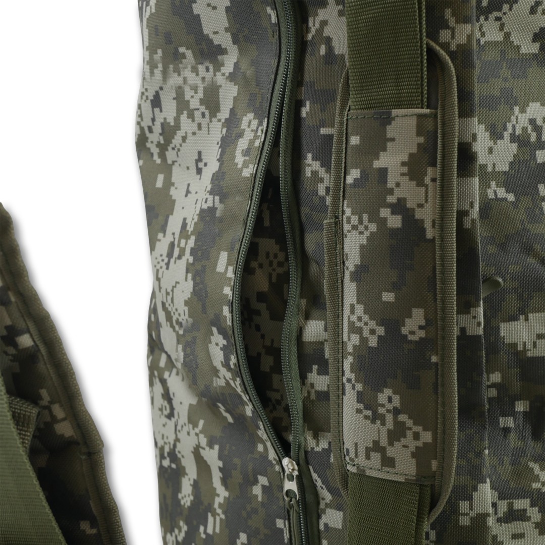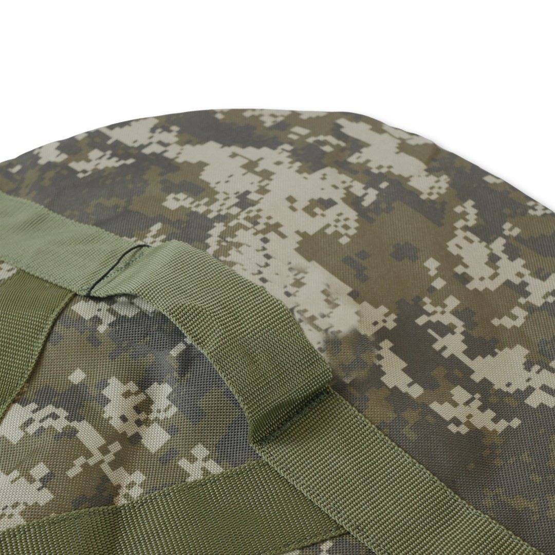 Сумка-баул призначена для перенесення особистих речей, військових, спортивних, туристичних або мисливських приладдя. Особливістю цієї моделі є можливість носіння як сумки, так і рюкзака. Вона виконана з міцної водовідштовхувальної тканини піксельного забарвлення, що забезпечує надійний захист вмісту.