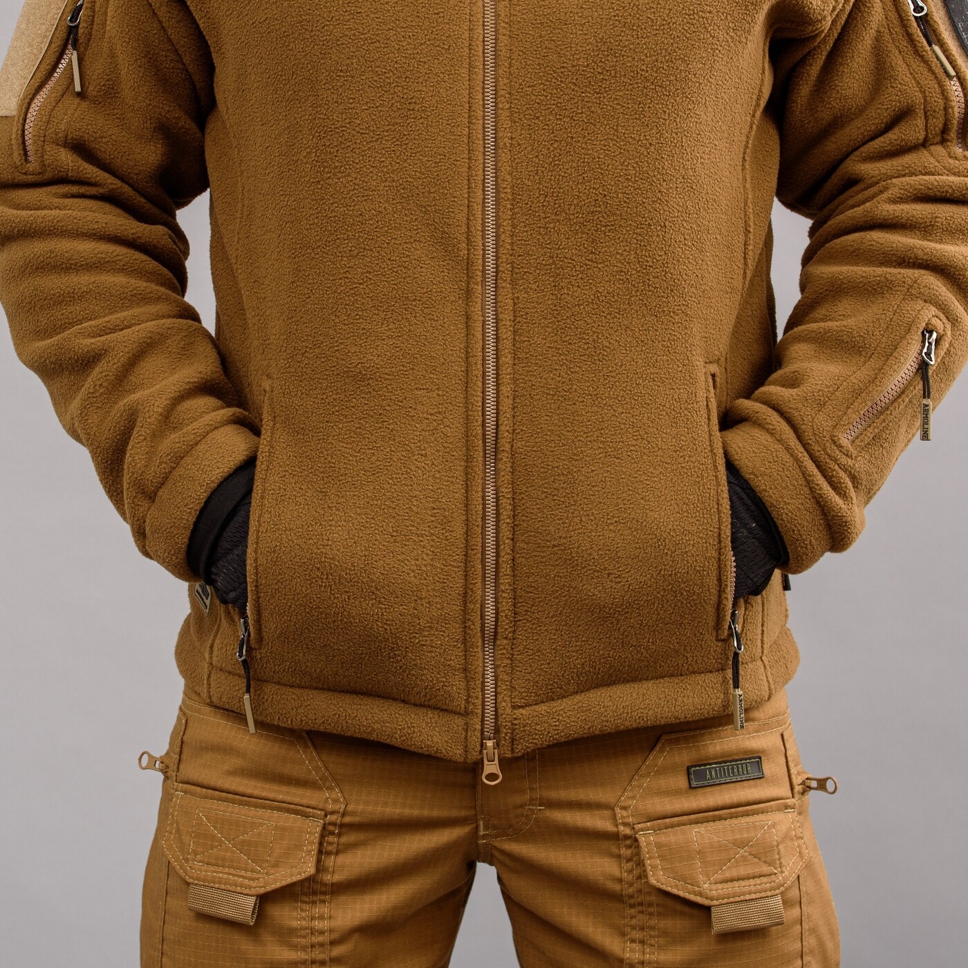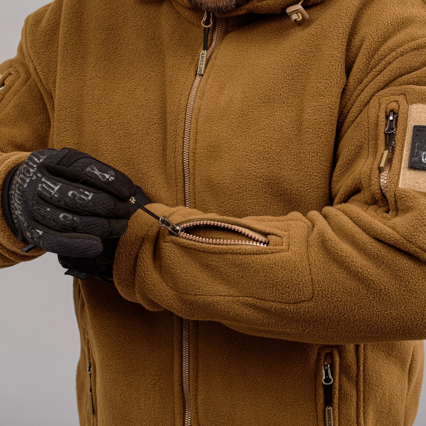 - Манжети рукавів на гумці, на лівому рукаві – 2 кишені на блискавках, на правому рукаві – 1 кишеня на блискавці.