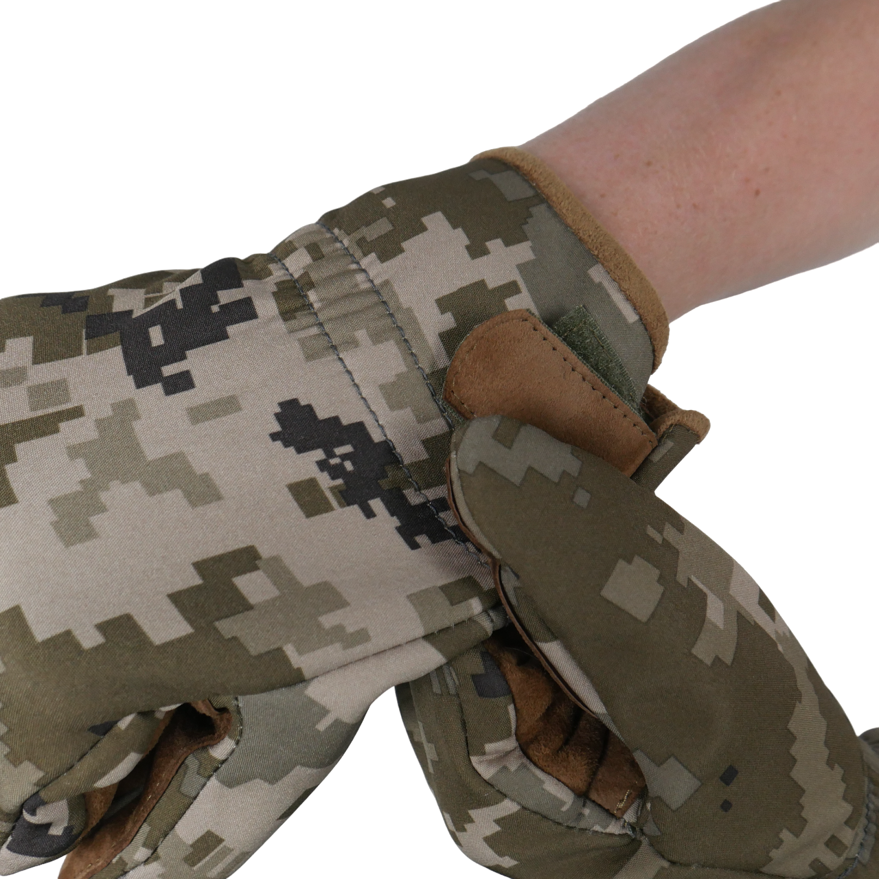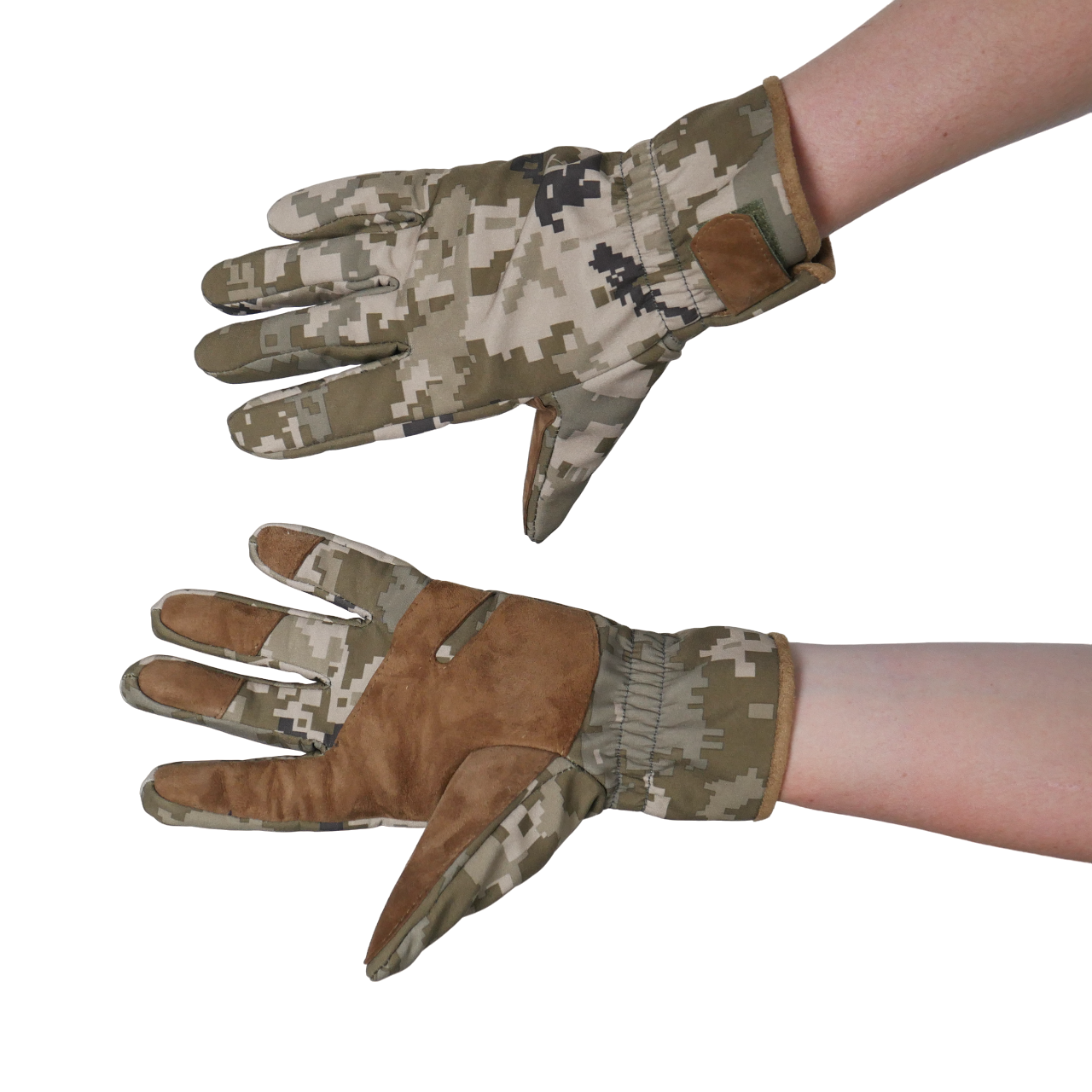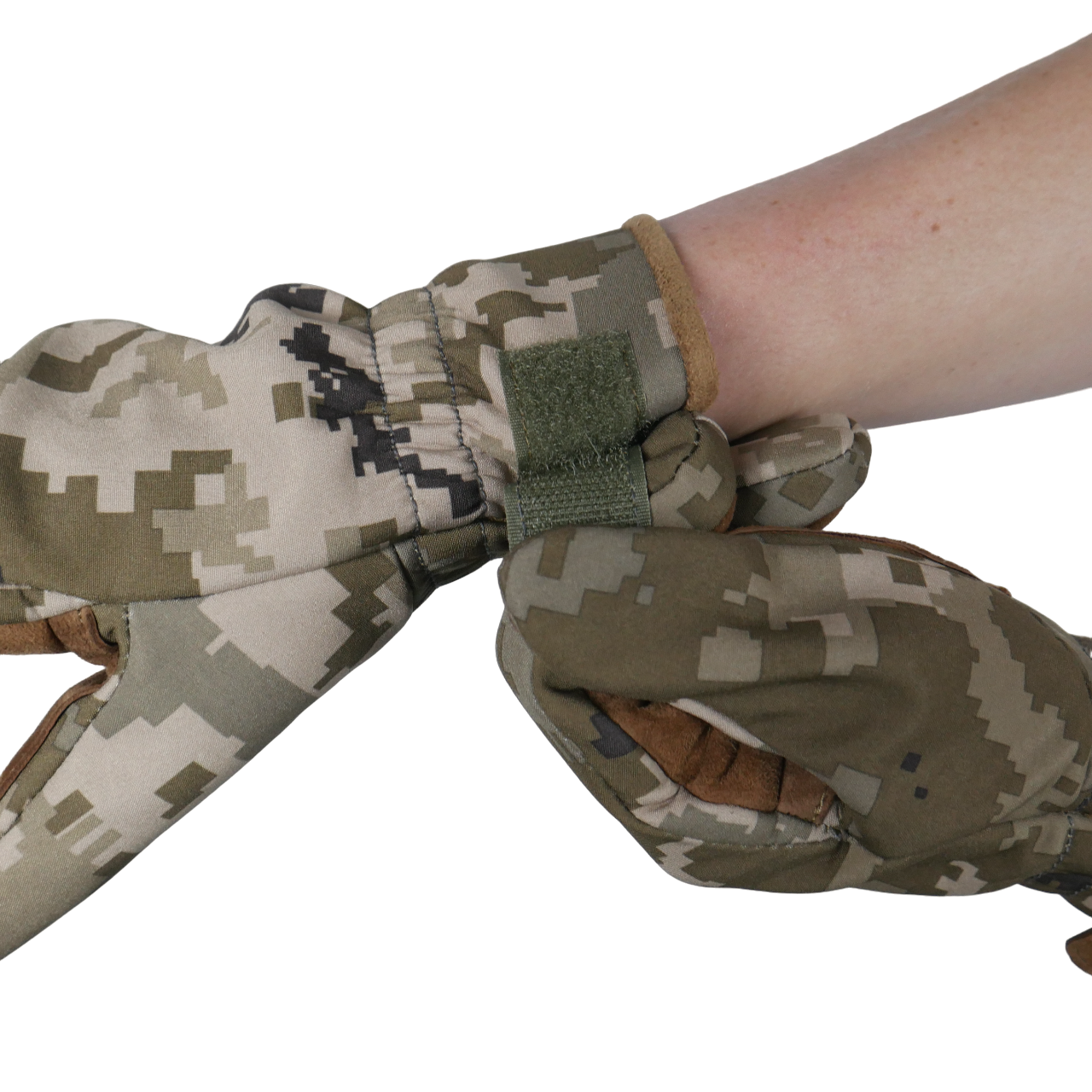 Зимові рукавиці Піксель Softshell – матеріал софтшел 340 (піксель), долонна частина з захисним покриттям із натуральної замші. Вітрозахисна тканина софтшел у поєднанні з флісом забезпечує надійний захист від холоду, що робить рукавички ідеальними для зимових умов.