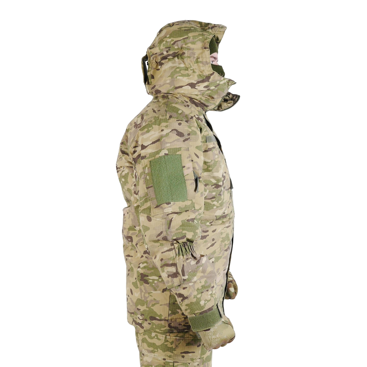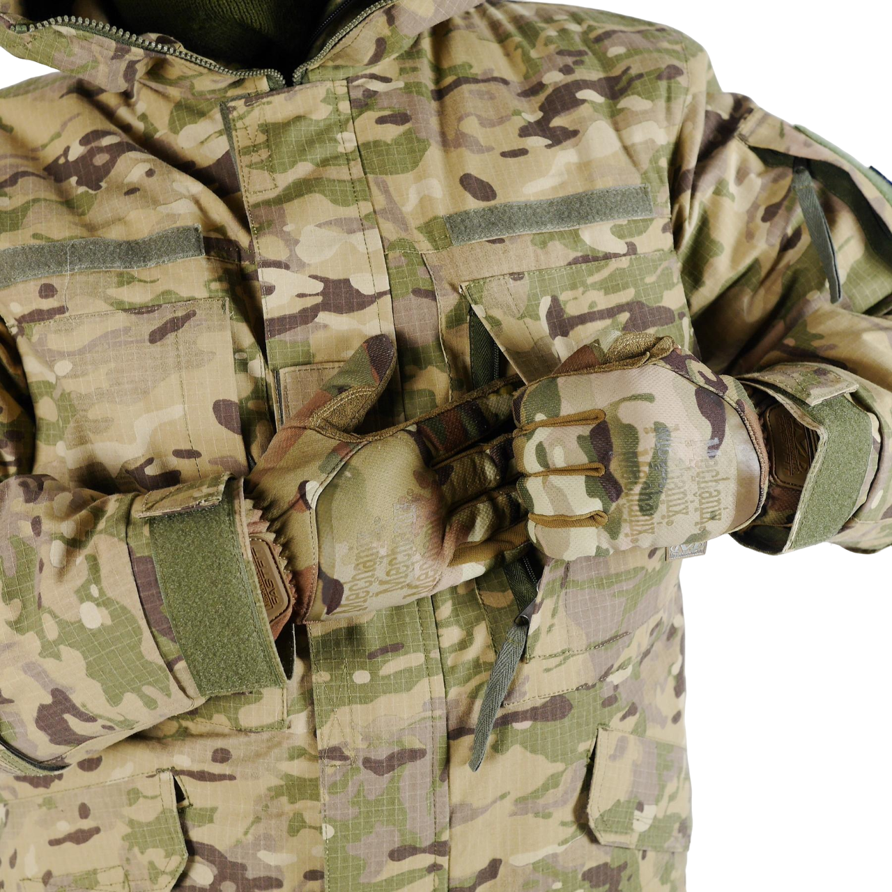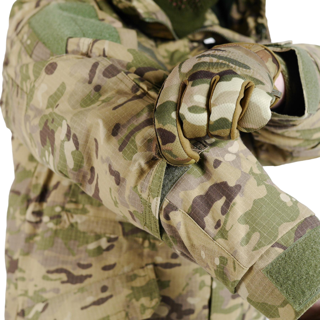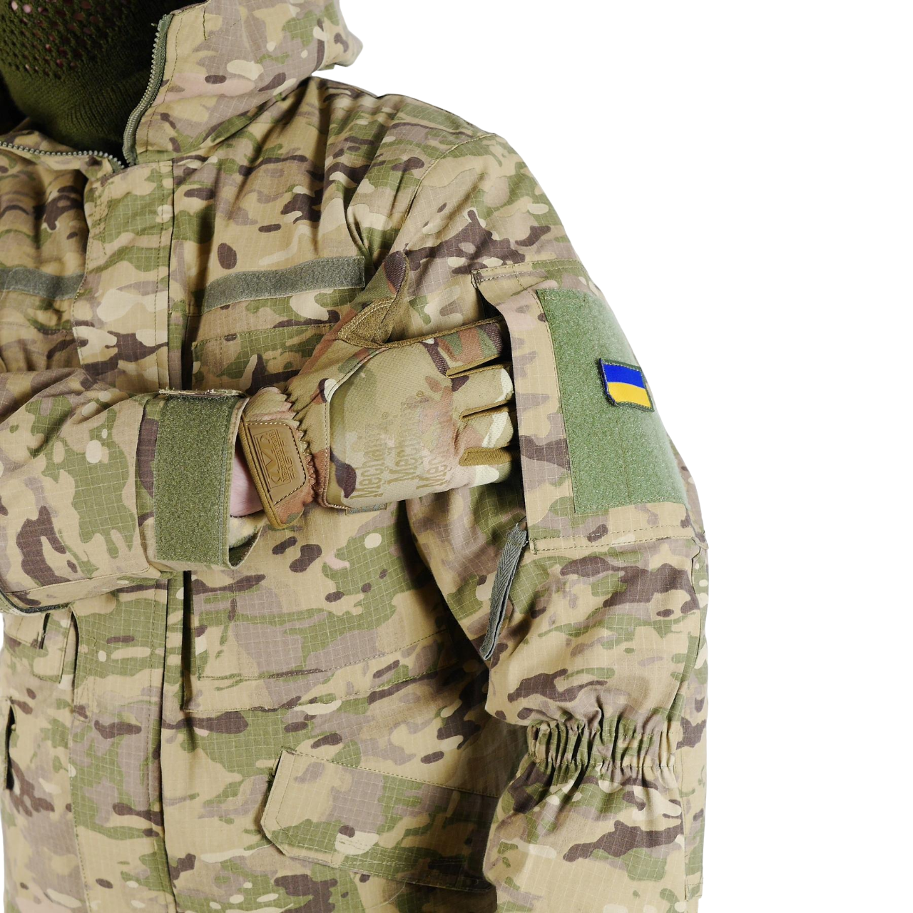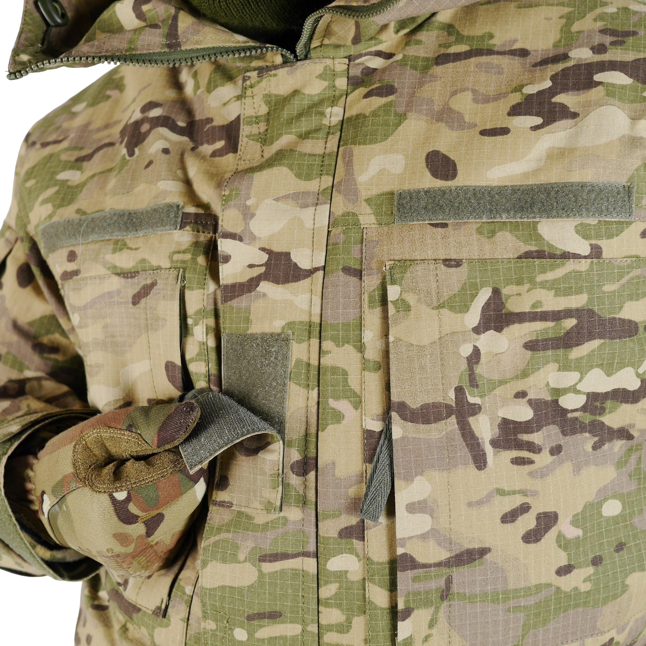 - Велкро-панелі: На обох рукавах і на грудях для кріплення шевронів та інших ідентифікаційних знаків.